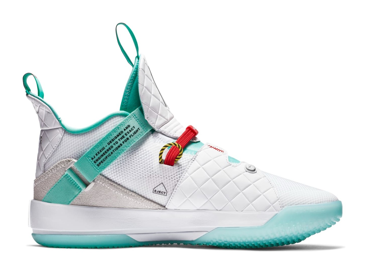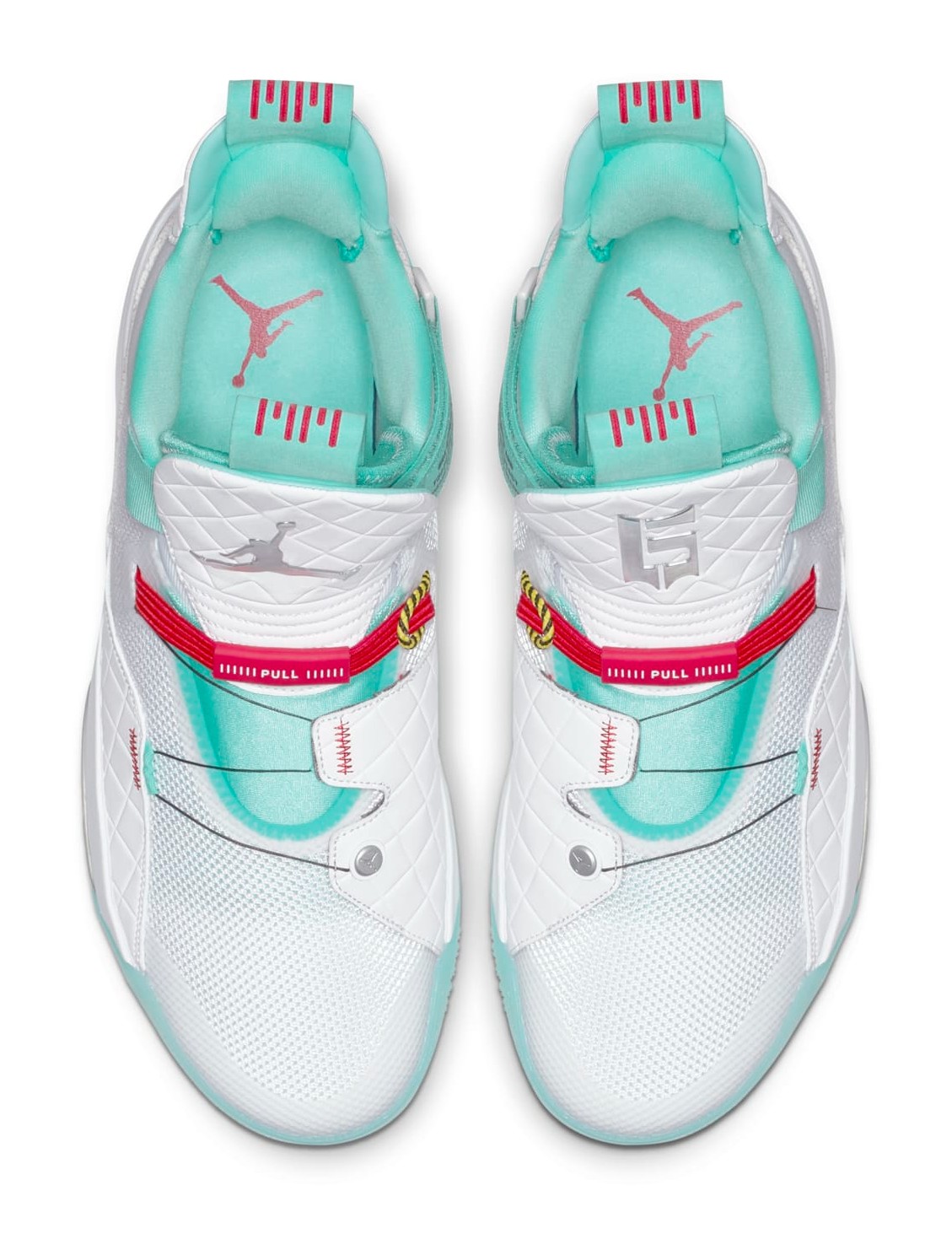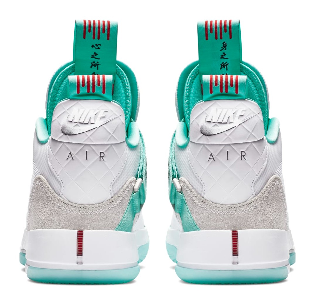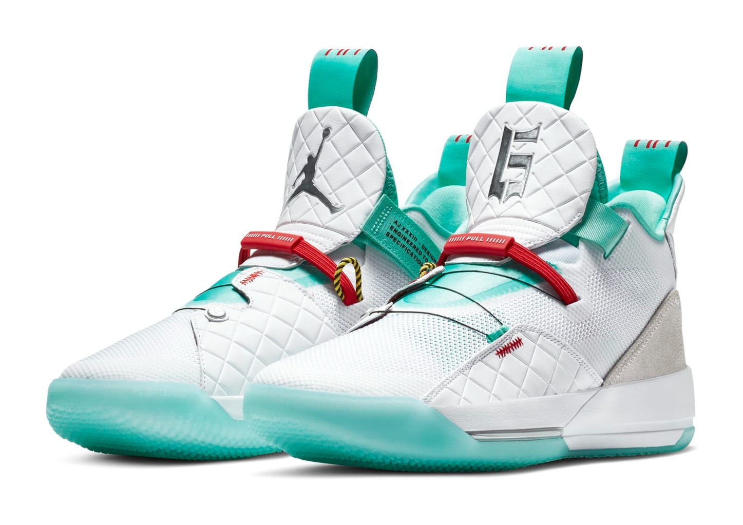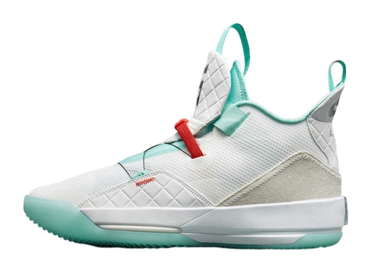 The Air Jordan 33 PF 'Guo Ailun' PE (Player Exclusive) is a high-performance basketball shoe that was part of a special release celebrating Chinese basketball star Guo Ailun. The shoe features a White knit and synthetic upper, complemented by a luxurious quilted leather panel on the tongue. The signature element is the use of Clear Jade (a bright green/teal), which is Guo Ailun's favorite color, on the FastFit system underlay, the pull tabs, and the translucent outsole. University Red and Metallic Silver are used for contrast on the branding and detailing. Unique elements include the Chinese characters on the pull tab and a personalized logo for Guo Ailun on the right tongue, emphasizing its Player Exclusive status. The PF construction includes a durable outsole suitable for versatile court use.