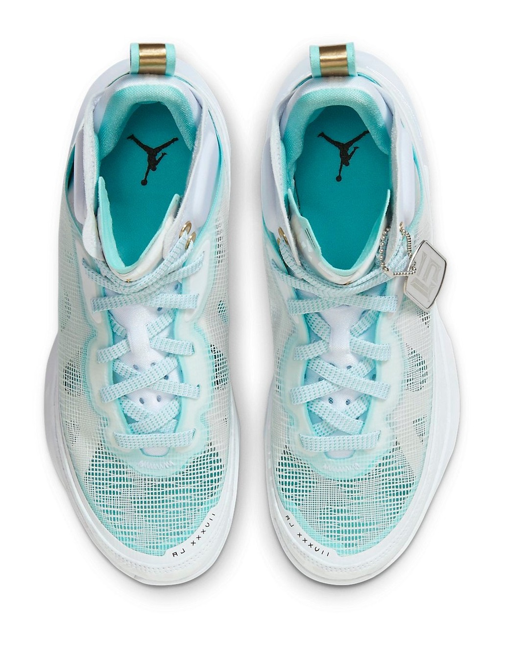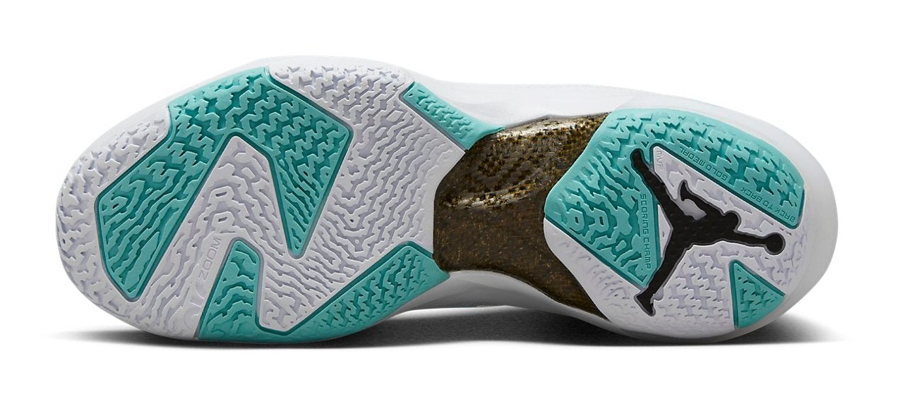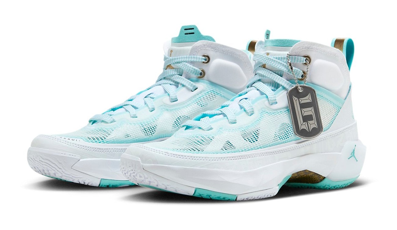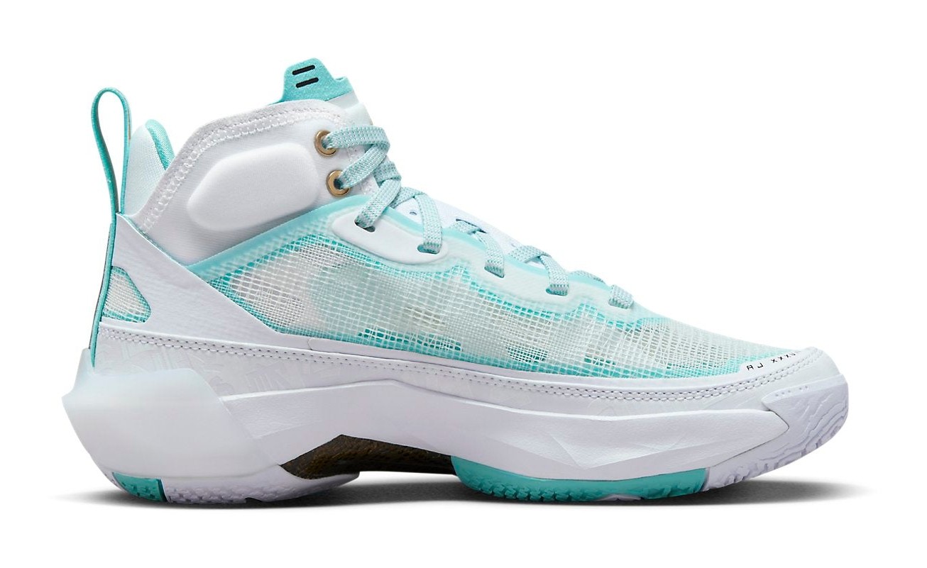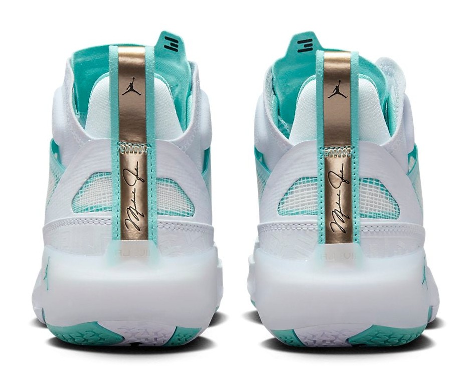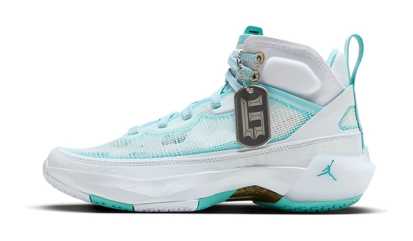 The Air Jordan 37 'Guo Ailun' is a special Player Exclusive (PE) colorway for Chinese basketball star Guo Ailun. The sneaker features his customary signature colors, with a crisp White upper made from reinforced leno-weave and synthetic materials. The white is contrasted by Hyper Jade (also referred to as Island Green or mint green) accents, which appear on the piping, inner lining, and in the translucent nature of the leno-weave. Metallic Gold details add a touch of premium aesthetic on the top eyelets and the heel pull tab. The tongue is embossed with Chinese characters, a personal detail for Ailun. The shoe utilizes Air Jordan 37's performance technology, including Formula 23 foam and a Zoom Air unit, and is considered a limited release, often having a more regional focus in Asia.