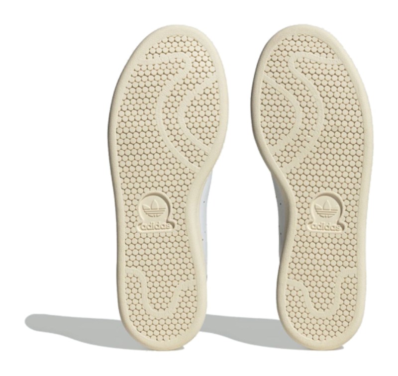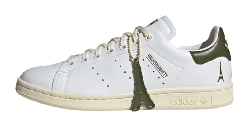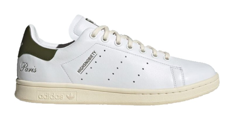 This collaboration with the media brand Highsnobiety, themed after their "Not In Paris" project and pop-up gallery "HIGHArt," delivers a refined, mostly monochrome version of the classic Stan Smith. The upper is constructed from premium tumbled leather in a clean Cloud White. It maintains the original silhouette, but replaces the standard green heel tab with a co-branded black heel tab that features the Highsnobiety logo in place of the standard Trefoil. The traditional perforated 3-Stripes are present on the side. The overall look is elevated by a slight vintage feel provided by the Cream White colored outsole and a co-branded sockliner and tongue. The shoe came with an exclusive "Highsnobiety in Paris" keychain.