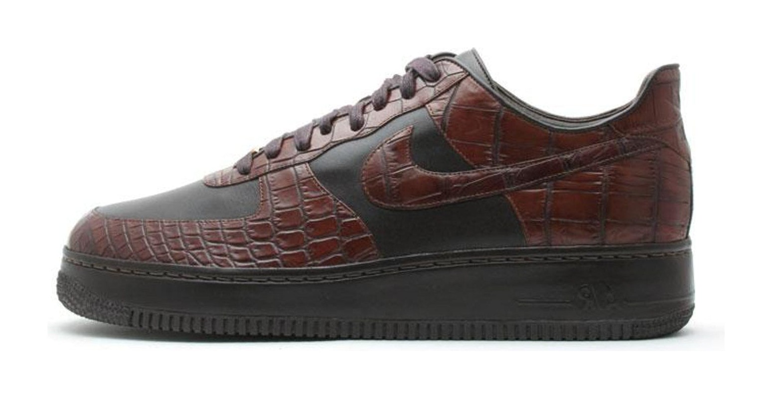 This incredibly luxurious and rare low-top was handcrafted in Italy to celebrate the 25th anniversary of the Air Force 1. It features a Baroque Brown upper constructed with a combination of supple Italian leather and genuine crocodile skin on the Swooshes and heel tab. The shoe is elevated by 24K gold-plated lace deubrés and lace tips, and came in a special silver "Air Force XXV" box, complete with cedar shoe trees and a large, real gold hangtag. It was released in extremely limited quantities of only 2,500 pairs.