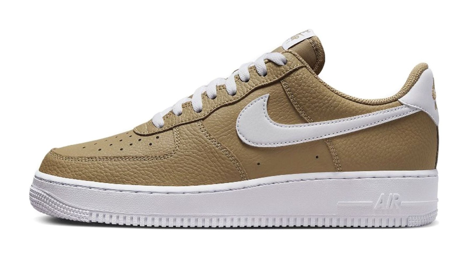 This is a clean, two-tone colorway of the classic Air Force 1 Low '07. It features a predominantly Khaki (light brown/tan) tumbled leather upper for a premium look. The khaki color is contrasted with bright white accents on the leather Swooshes, laces, heel tab, and the entire Air Force 1 sole unit, creating a stylish and versatile everyday sneaker.