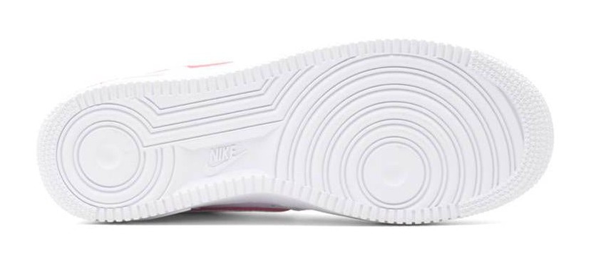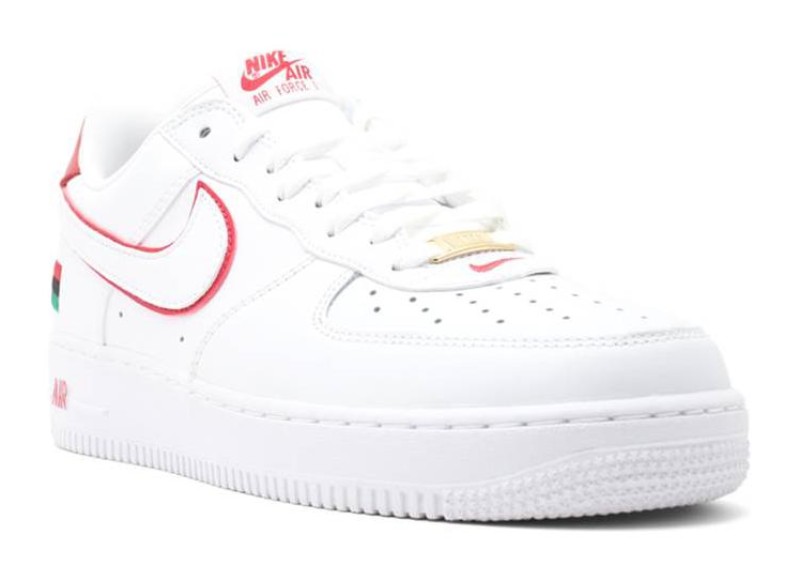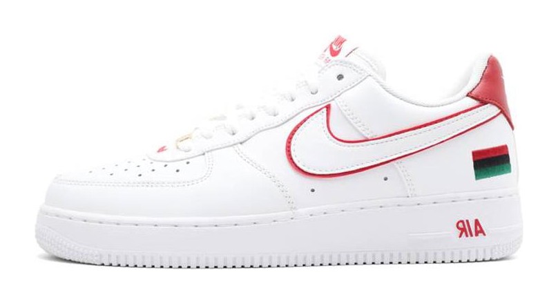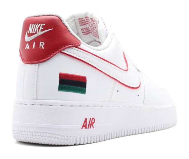 This sneaker is a retro release from 2015 to celebrate the 10th anniversary of an original 2005 Black History Month Air Force 1. It is built on a classic White-on-White tumbled leather foundation. Color accents of University Red are used to outline the Swoosh and appear on the heel tab. The most distinguishing feature is a small, embroidered Pan-African flag icon situated just below the heel counter, with the flag's colors also visible on the graphic print of the insole.