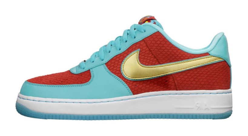 This sneaker celebrates the Chinese Zodiac's Year of the Dragon. The upper is made of sport red leather with a debossed pattern resembling dragon scales. Metallic gold appears on the Swoosh, while the shoe is finished with a white midsole and a sky blue outsole.