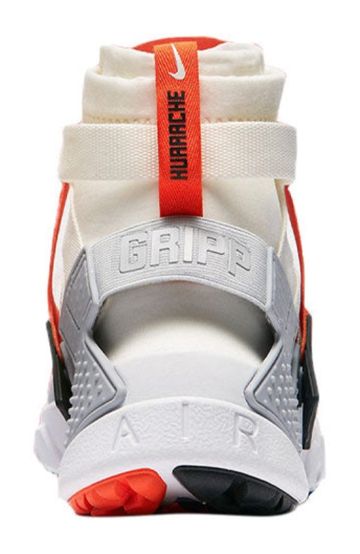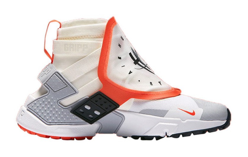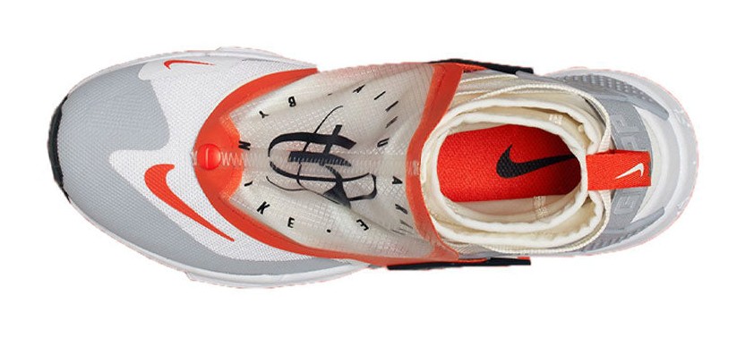 This sneaker is a high-top, utility-inspired revision of the Huarache, featuring a colorway inspired by vintage astronaut suits and space shuttles. The shoe has a white/Sail textile upper with a high, sock-like ankle bootie. The most notable feature is the semi-transparent, detachable lace shroud, outlined in striking Team Orange, which clips onto the Wolf Grey heel cage. This shroud and a more aggressive traction pattern enhance the shoe's all-weather, utility aesthetic.