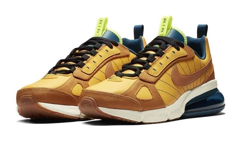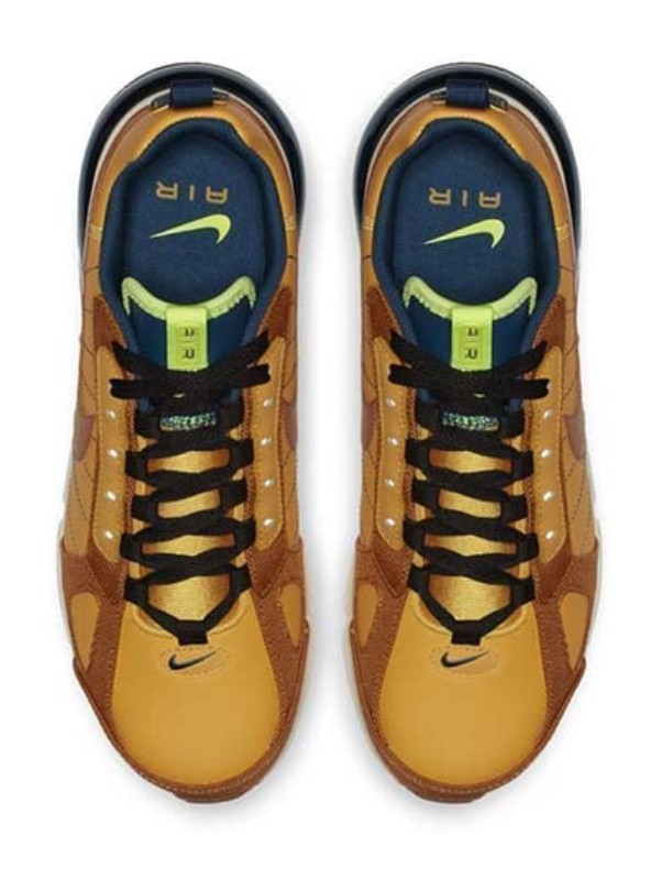 This version of the Air Max 270 features the paneled construction of the Futura model, taking cues from late '90s running designs. The upper is dressed in a tonal, earthy palette, primarily featuring shades of Yellow Ochre and Desert Ochre across its mix of textile and synthetic overlays. It provides cushioning via the large, visible Max Air 270 unit in the heel, which is complemented by a solid foam forefoot for all-day comfort.