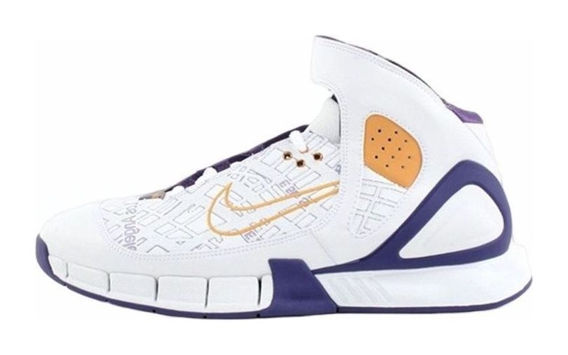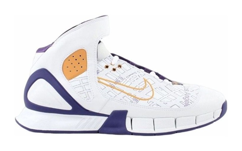 Worn by Kobe Bryant during the 2005-2006 NBA season, this special edition basketball shoe features a white leather upper with a perforated toe box. A unique, laser-etched map of Los Angeles covers parts of the white leather. The shoe also includes a visible Zoom Air unit in the heel, purple accents on the outsole, and gold details on the strap. The design is finished with a white midsole and a black Swoosh.