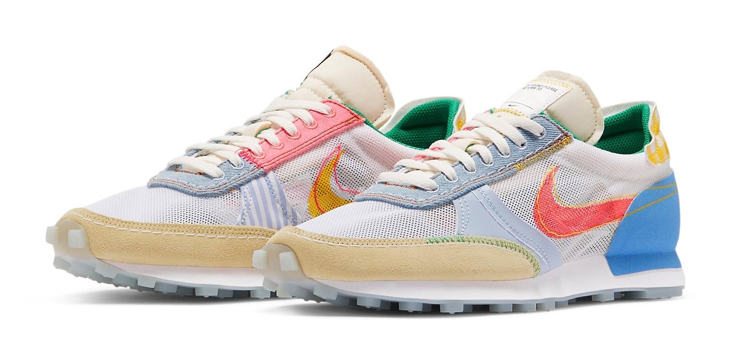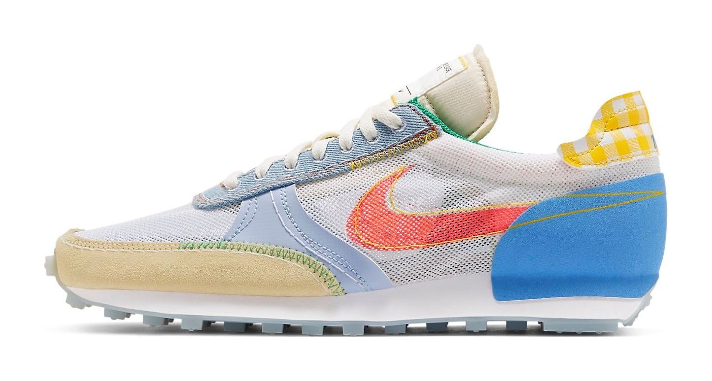 This shoe takes the low-profile track aesthetic of the Daybreak Type and applies the maximalist "What The" treatment. The upper is made of a chaotic mix of Suede, Leather, and Nylon materials in various colors like Sail (off-white), vibrant University Blue, electric Speed Yellow, and bold Bright Crimson. The design is deconstructed, featuring exposed foam tongues and visible zigzag stitching (the N.354 aesthetic). The sole features a durable rubber Waffle outsole, which offers a grip pattern inspired by the original 1970s Nike runners.