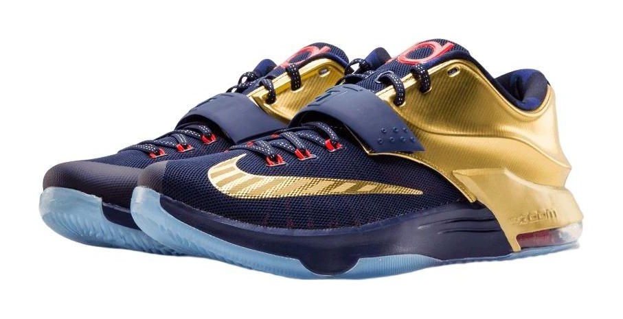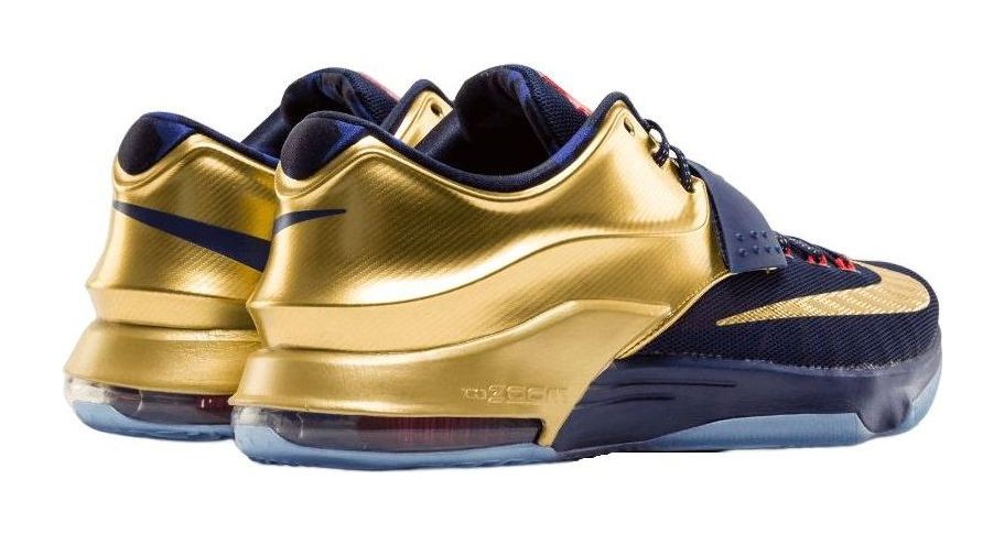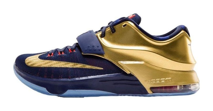 This colorway is inspired by Kevin Durant's performance in the 2014 FIBA World Cup. The upper is dressed in Midnight Navy, complemented by a striking Metallic Gold heel and collar, which symbolizes the gold medal. Bright Crimson accents the integrated Flywire cables and the KD logo on the tongue, completing the patriotic, winning color scheme. The shoe features a two-tone midsole with a Nike Zoom Air unit in the heel for responsive cushioning.