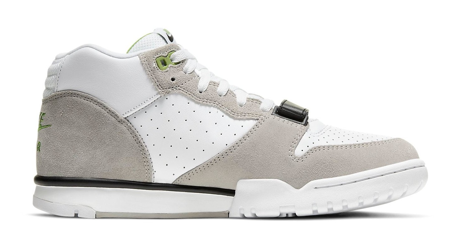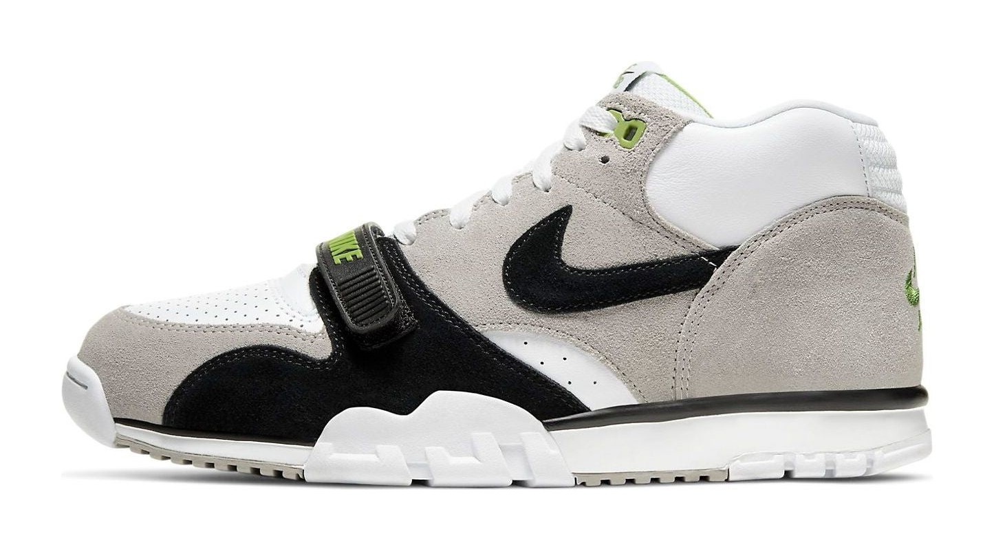 This shoe is a skateboarding version of the classic Air Trainer 1, first released in 1987. It features a mix of suede, leather, and synthetic materials in a grey, black, and white color scheme, with striking hits of Chlorophyll green on the tongue and heel. The shoe includes a strap across the forefoot, perforated leather details on the toe and collar, and a mesh panel around the ankle. It was reimagined for skateboarding with enhanced cushioning.