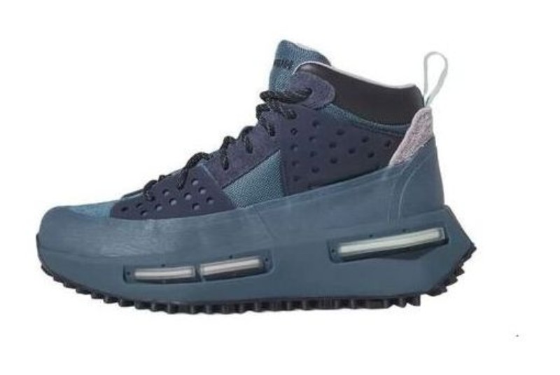 This model is part of the adidas and Pharrell Williams' Humanrace collaboration, featuring a monochromatic 'Indigo' color scheme that blankets the entire high-top silhouette. The rugged, boot-inspired upper utilizes a mix of textile and synthetic overlays in various blue hues, maintaining the signature rope laces and Humanrace branding on the tongue. The shoe sits atop a bulky, BOOST-encased midsole and a black rubber outsole with a chunky TPU plug system. The indigo colorway offers a bold, utility-meets-fashion look for Fall/Winter.