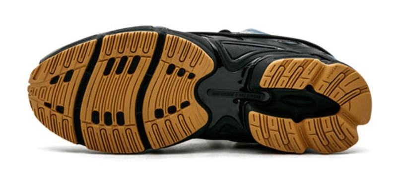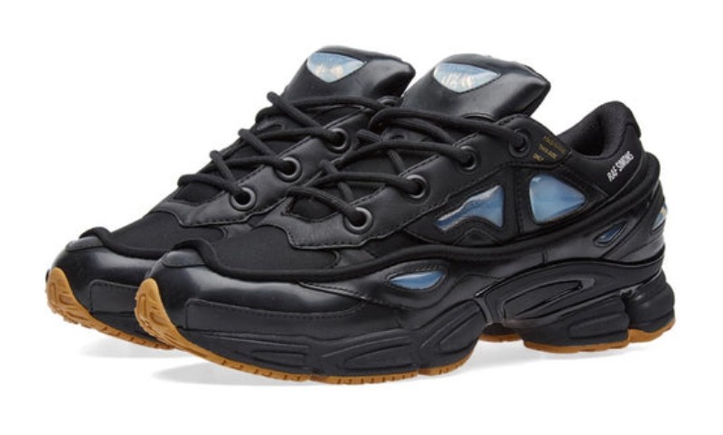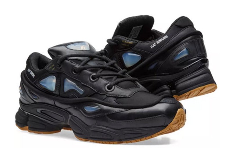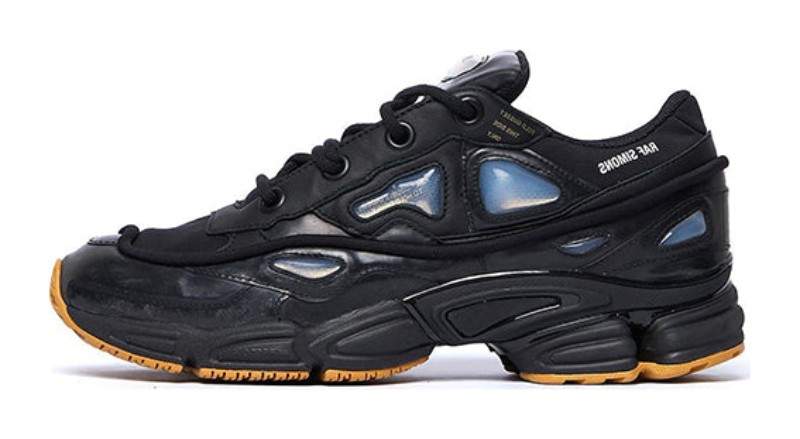 This shoe is executed in an almost entirely Core Black color scheme, giving it a sleek, stealthy, and high-fashion look. The upper is constructed with a dual-layer mix of rubberized textile and leather, featuring the collaboration's signature futuristic, protruding silicone bubbles on the side panels. The black upper is contrasted by the Mesa color, which appears on the chunky outsole, providing a gum-like finish that breaks up the monochrome design. Discreet Raf Simons branding is present near the ankle, and the lacing system includes unique text instructions printed around the eyelets, a distinctive mark of the designer's work with the classic Ozweego silhouette. The midsole utilizes Adiprene cushioning.