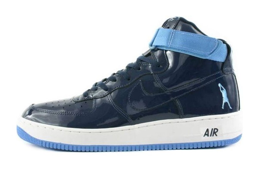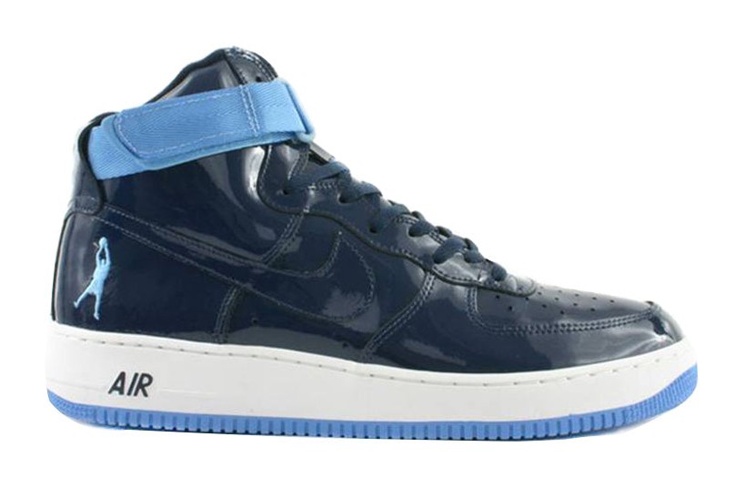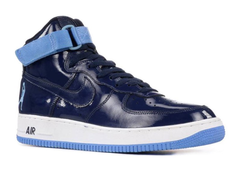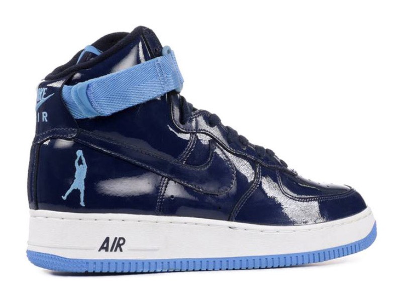 This is a highly sought-after retro model of the Air Force 1 High that pays tribute to NBA legend Rasheed Wallace, who famously wore the AF1 High on court. The shoe is constructed primarily of Midnight Navy patent leather for a glossy finish, covering the entire upper. University Blue and White accents are typically found on the branding and outsole, contrasting with the dark navy for a collegiate or Detroit Pistons-inspired look. The shoe is characterized by its high-cut silhouette and Sheed's signature silhouette logo positioned on the heel, replacing the traditional Nike Air branding.