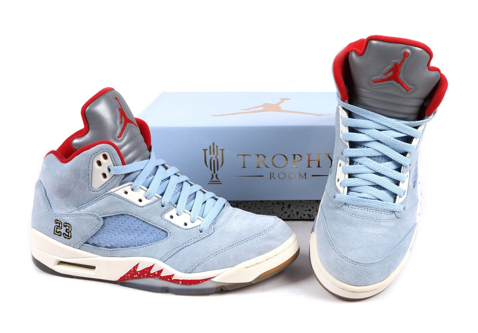 The Trophy Room x Air Jordan 5 Retro SE 'Ice Blue' is a collaboration with Trophy Room, a sneaker boutique owned by Marcus Jordan, Michael Jordan's son, and is inspired by the trophy room in the Jordan family home. The shoe features an upper constructed from premium Ice Blue suede. Accents include University Red on the lining, tongue trim, and a small Jumpman logo, while Metallic Gold appears on the lace lock and branding. The heels are embroidered with Michael Jordan's number '23' on the right shoe and Marcus Jordan's number '5' on the left. The translucent rubber outsole reveals a unique wood-grain graphic, referencing the flooring of the trophy room. This release was limited to 7,000 individually numbered pairs.