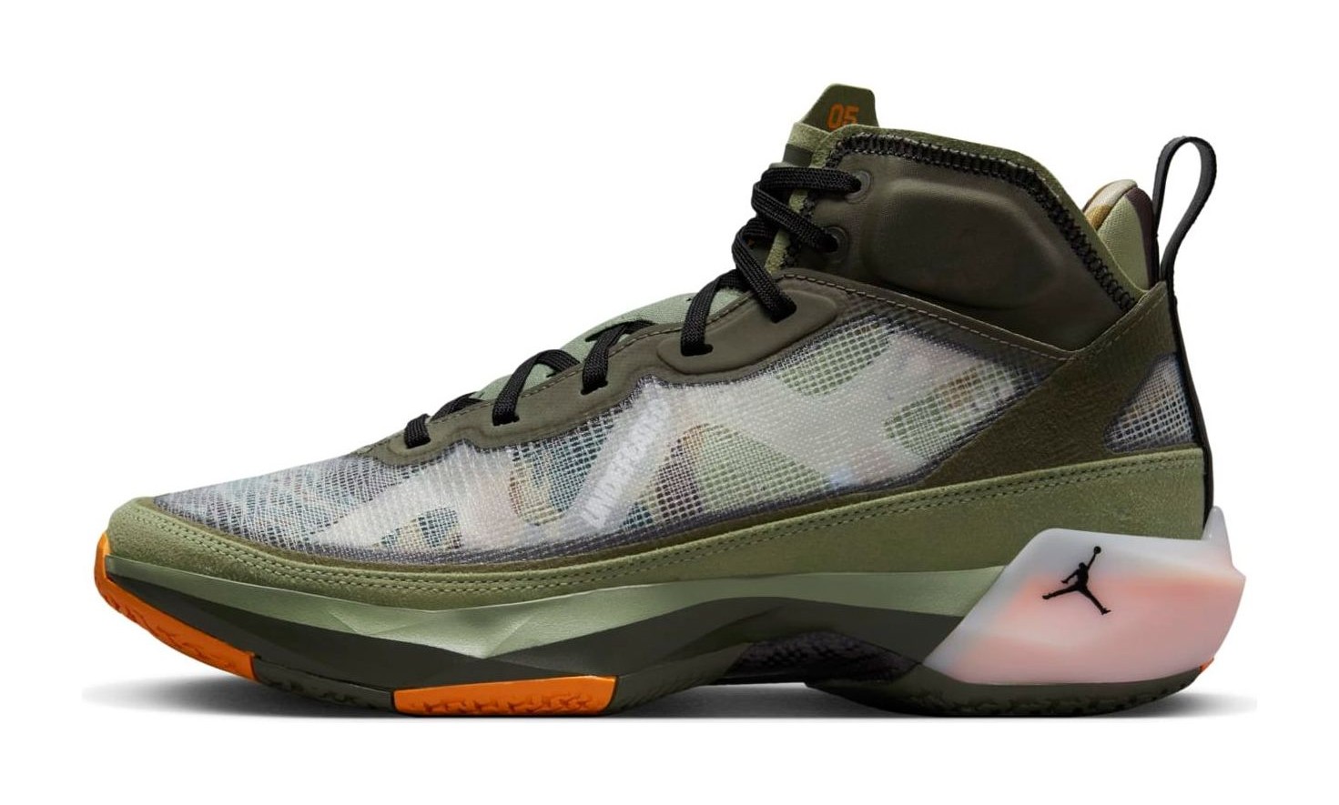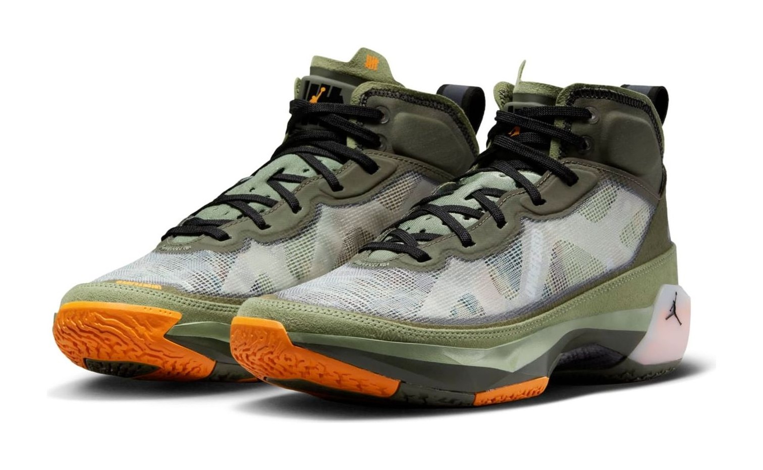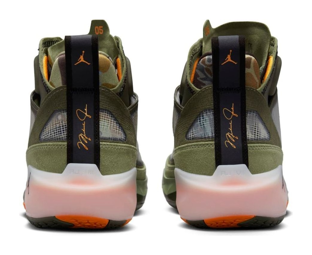 The Air Jordan 37 SP 'Flight Jacket' is a highly anticipated collaboration with the influential Los Angeles-based retailer Undefeated, marking their first Air Jordan release since 2005. The design is inspired by the iconic military MA-1 "Flight Jacket," featuring a color scheme dominated by Oil Green and Twilight Marsh (military/olive green tones) across the reinforced leno-weave upper, with striking accents of Orange Horizon (bright orange) on the lining, heel tabs, and outsole. Camouflage graphics are featured beneath the semi-translucent upper and on the custom insoles. Co-branding is prominent, with the Undefeated '5-Strikes' logo replacing the Jumpman on the tongue label, and additional Undefeated branding is visible on the toe cap. The shoe features the Air Jordan 37's performance technology, including a double-stacked Air unit in the forefoot and Formula 23 foam in the heel for takeoff and impact protection.