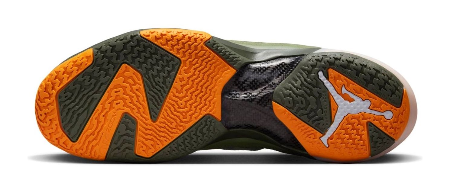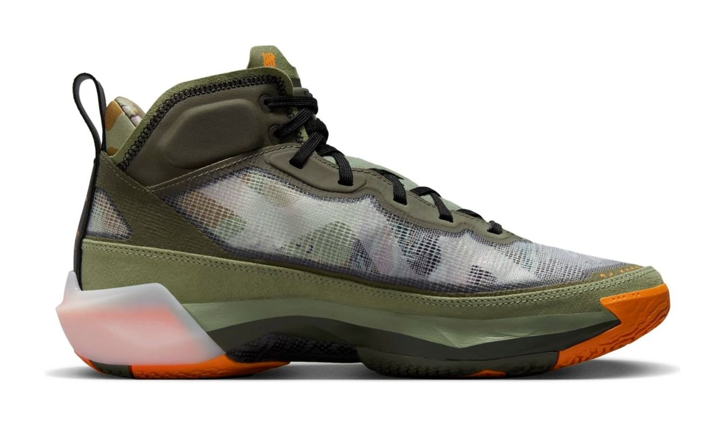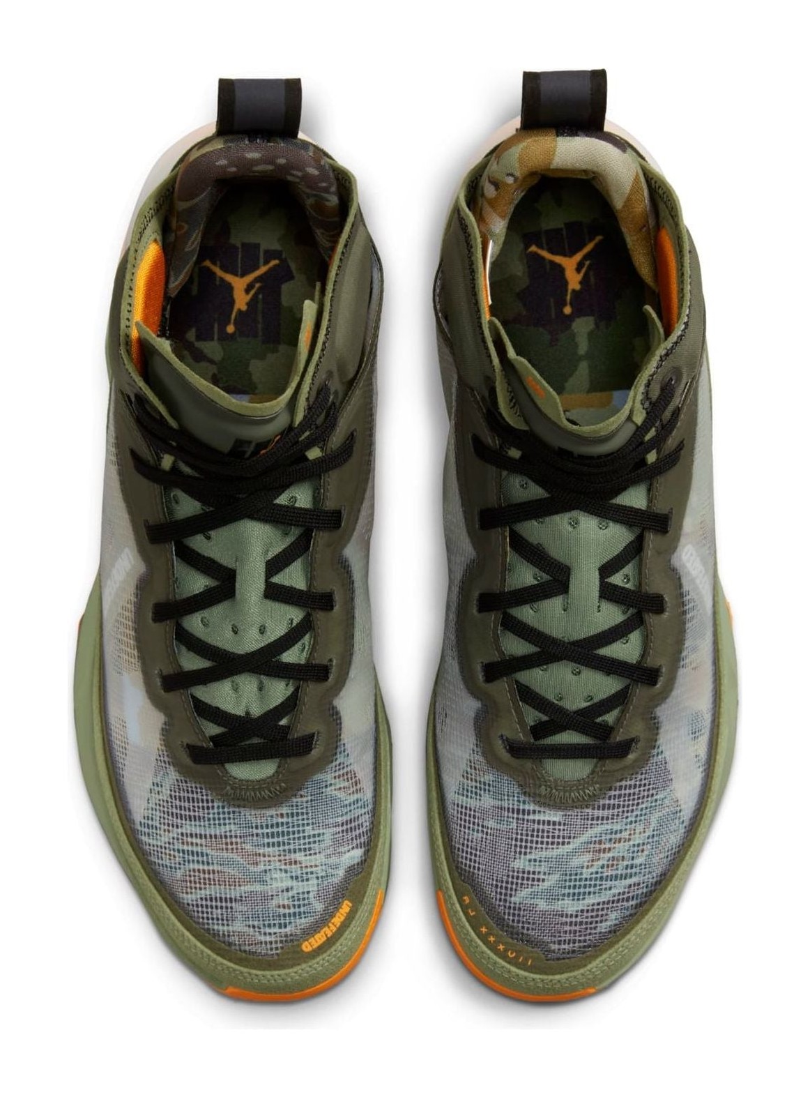 The Air Jordan 37 SP 'Flight Jacket' is a highly anticipated collaboration with the influential Los Angeles-based retailer Undefeated, marking their first Air Jordan release since 2005. The design is inspired by the iconic military MA-1 "Flight Jacket," featuring a color scheme dominated by Oil Green and Twilight Marsh (military/olive green tones) across the reinforced leno-weave upper, with striking accents of Orange Horizon (bright orange) on the lining, heel tabs, and outsole. Camouflage graphics are featured beneath the semi-translucent upper and on the custom insoles. Co-branding is prominent, with the Undefeated '5-Strikes' logo replacing the Jumpman on the tongue label, and additional Undefeated branding is visible on the toe cap. The shoe features the Air Jordan 37's performance technology, including a double-stacked Air unit in the forefoot and Formula 23 foam in the heel for takeoff and impact protection.