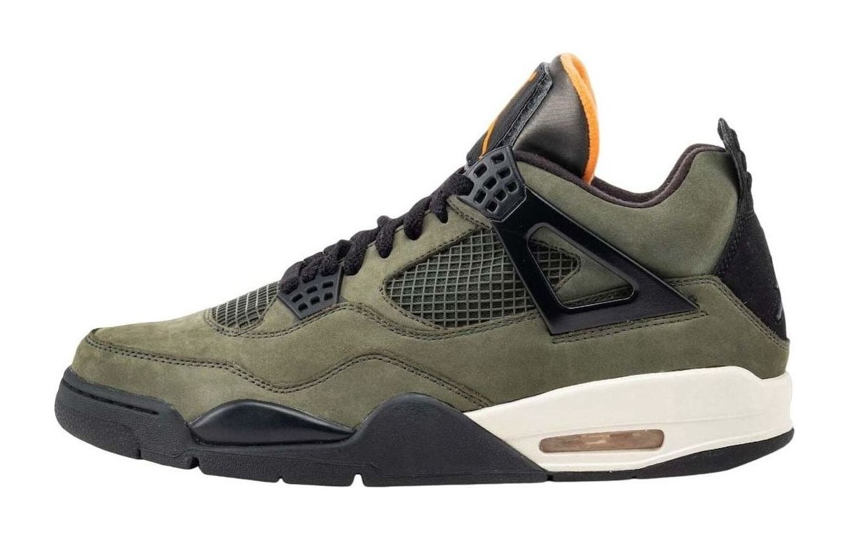 The Air Jordan 4 Retro OG SP Undefeated 'Deep Green' (IB1519-200) is the 2025 re-release of one of the most famous and rarest collaborations in sneaker history, originally released in 2005. The colorway is inspired by the military MA-1 flight jacket. It features a Deep Green nubuck upper with contrasting Black accents on the wings, netting, and midsole. Vivid Clementine (orange) is used for the lining and branding details, while a Sail (off-white) midsole adds a vintage look. The heel features the coveted 'Nike Air' branding, and the insole has the UNDEFEATED five-strikes logo. This is a highly anticipated and limited retro of a true sneaker grail.