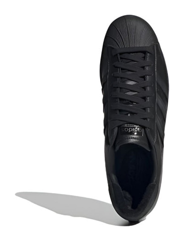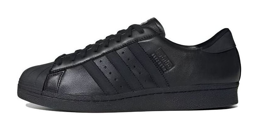 This men's sneaker features an all-black leather upper with a classic black rubber shell toe and matching black serrated three-stripes. It is a "Triple Black" colorway, meaning the black color is uniform across the upper, laces, sole, and branding.