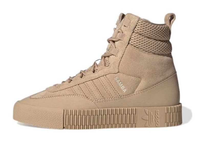 This women's ankle boot features a soft, heavy suede upper in a neutral beige or "Pale Nude" colorway. It draws inspiration from the classic Samba sneaker but offers a higher-profile, boot-like silhouette. The design includes padded mesh tongues and ankle collars for comfort, and a stacked rubber outsole for an elevated look. The boot also features the traditional Samba branding and serrated Three-Stripes.