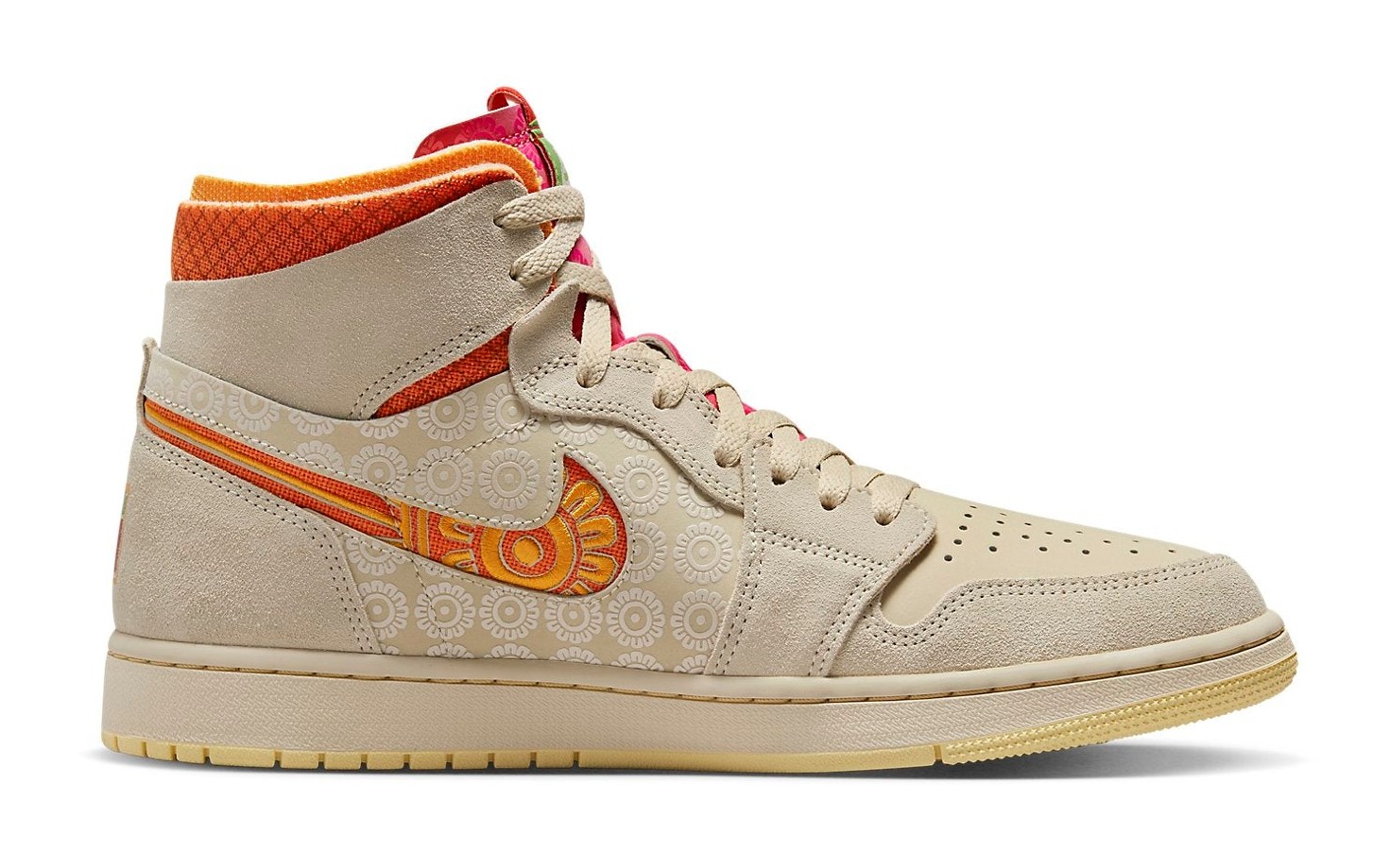 This sneaker is a vibrant tribute to the Mexican holiday Día de Muertos (Day of the Dead). The design is inspired by the traditional candles and Cempasúchil (Mexican Marigold) flowers used on the ofrendas. It features a mixed-material upper with Rattan (beige) leather and suede overlays. The shoe has a prominent Kumquat/Starfish orange color on the ankle collar and the intricately stitched Swoosh, which is patterned to resemble the marigold flower. A colorful, cross-hatched pattern is found on the collar, and a monarch butterfly logo (believed to carry the souls of the deceased) is embossed on the heel. The phrase "Somos Familia" is a key part of the collection's theme.