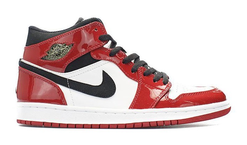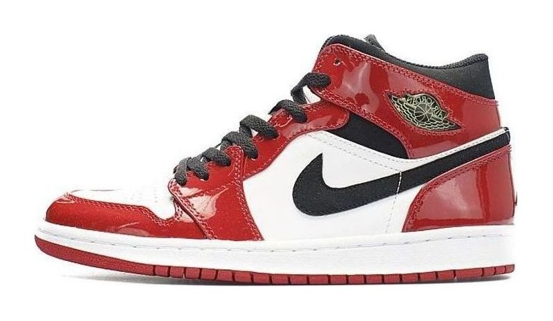 This 2003 retro is a mid-cut version of the Air Jordan 1, which was common for non-OG (Original) retros at the time, typically featuring eight lace holes instead of the original's nine. The entire upper is constructed from patent leather, giving the classic "Chicago Bulls" colors—Varsity Red, White, and Black—a high-gloss, flashy finish that was popular in the early 2000s. The color blocking is true to the "Chicago" theme, with a white toe box and mid-panel, Varsity Red overlays, and black on the collar and heel. A notable feature is the use of the Jumpman logo on the tongue and heel, replacing the original "Nike Air" branding.