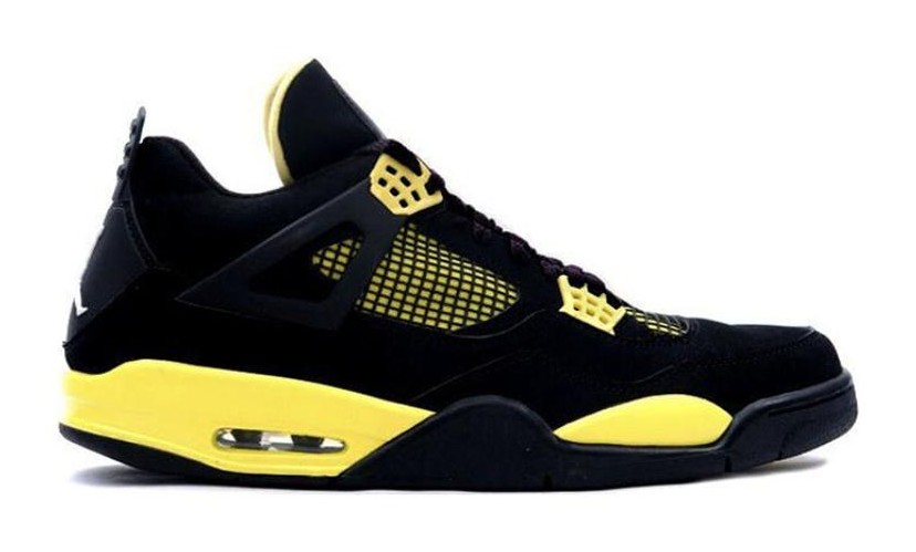 The Air Jordan 4 Retro 'Thunder' (2006) was the original release of this colorway, which was inspired by Michael Jordan's Motorsports team and his passion for motorbikes. It features an upper constructed almost entirely of black nubuck, giving it a premium look. The striking 'Tour Yellow' color is used for the accents, notably appearing on the netting underlays, the tongue lining, and the majority of the midsole, creating a high-contrast look against the black upper. White is minimally used on the Jumpman logos on the heel and outsole. This 2006 version was a highly exclusive release, originally sold only on the Jumpman23 website and came bundled with a matching jacket for a premium retail price.