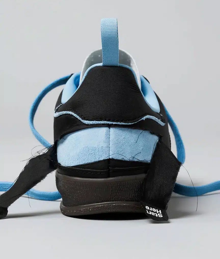 This sneaker is a highly unique and limited edition collaboration. The shoe features a two-layer upper: the visible top layer is a tear-away material in Black, which can be scraped, cut, or removed to reveal a vibrant Blue suede layer underneath. This tear-away effect embodies the "Diamonds in the Rough" theme. The exterior design features crisp White Adidas 3-Stripes branding on the sides, which contrasts sharply with the black upper. Further contrast is added by the visible tongue, heel tab, laces, and ankle collar, all in a bright Blue color, hinting at the hidden layer. A key feature is the numbering inside the ankle collar, with each pair explicitly marked out of the 800-pair limit. The shoe is finished with a standard rubber outsole.