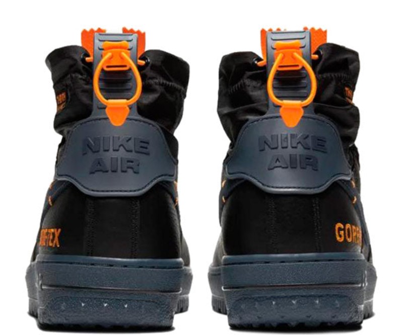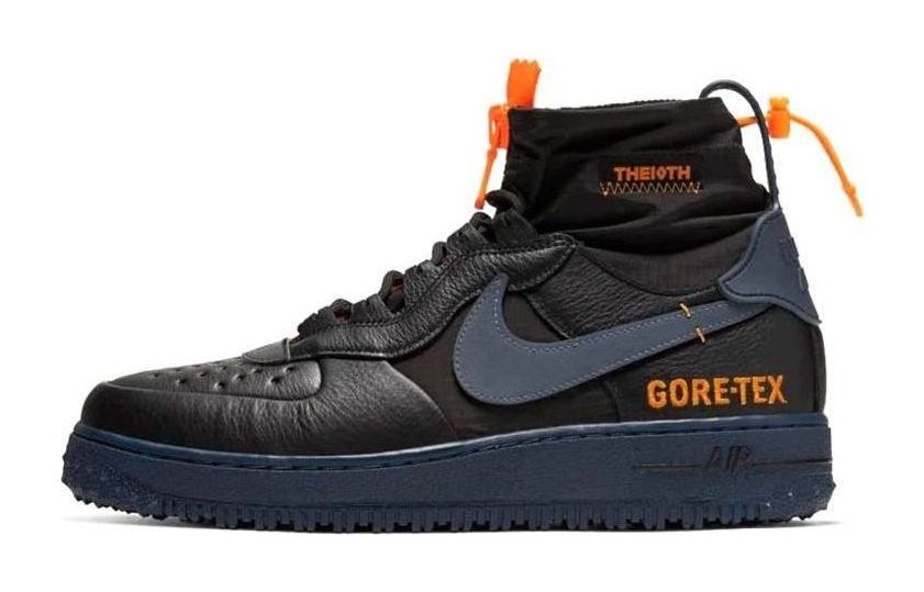This special-edition Air Force 1 was engineered to be waterproof for harsh weather conditions. It features a black leather upper and a zippered nylon bootie for a modern, functional look. The design incorporates military-inspired details and includes a rugged outsole for improved traction on slick surfaces.