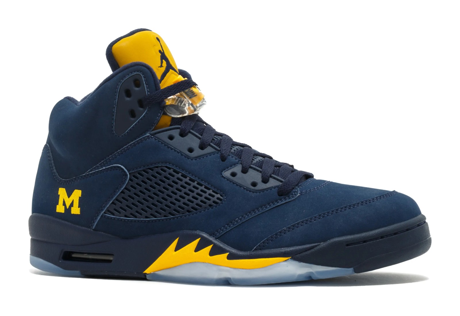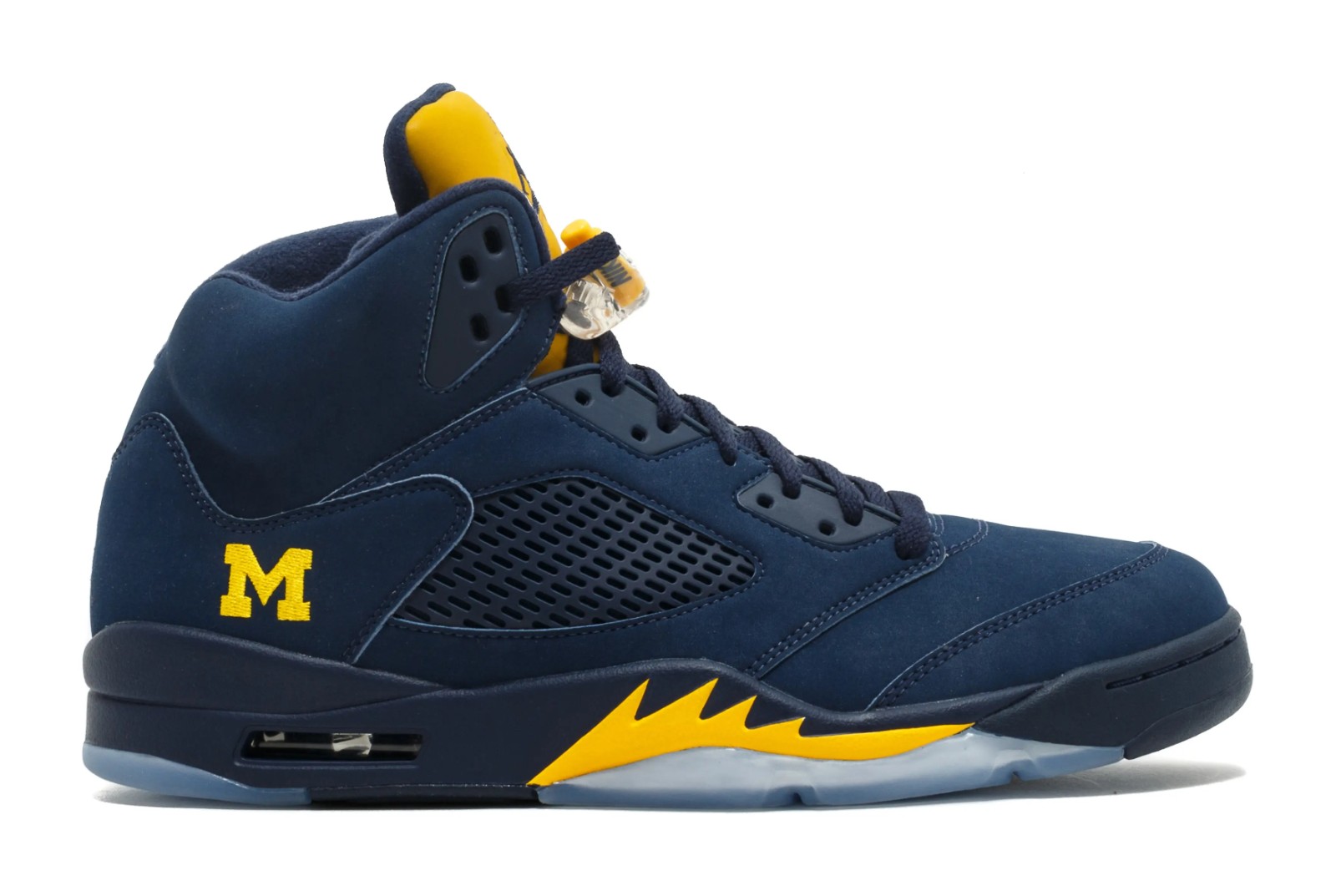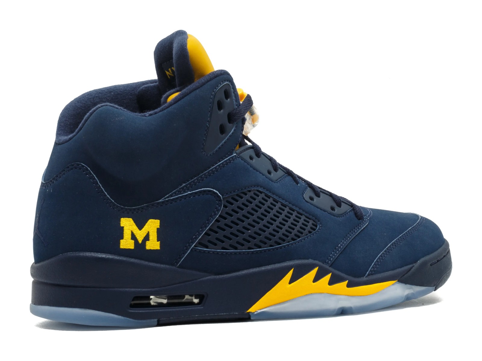 The Air Jordan 5 Retro 'Michigan Wolverines' PE is an extremely rare Player Exclusive sneaker made specifically for the athletes and staff of the University of Michigan, an athletic program sponsored by the Jordan Brand. The shoe features the university's color scheme with a College Navy nubuck or suede upper. The tongue and the distinctive 'shark tooth' detailing on the midsole are also in College Navy. The 'Army' or 'Amarillo' (yellow) color is used for the signature accents, most notably on the Jumpman logos and the midsole detailing. The most unique features are the University of Michigan's "M" logo embroidered on the tongue in place of the usual Jumpman, and the number "23" stitched onto the heel. The shoe sits atop a translucent outsole. As a Player Exclusive, this pair was never released to the public and is only available on the secondary market.