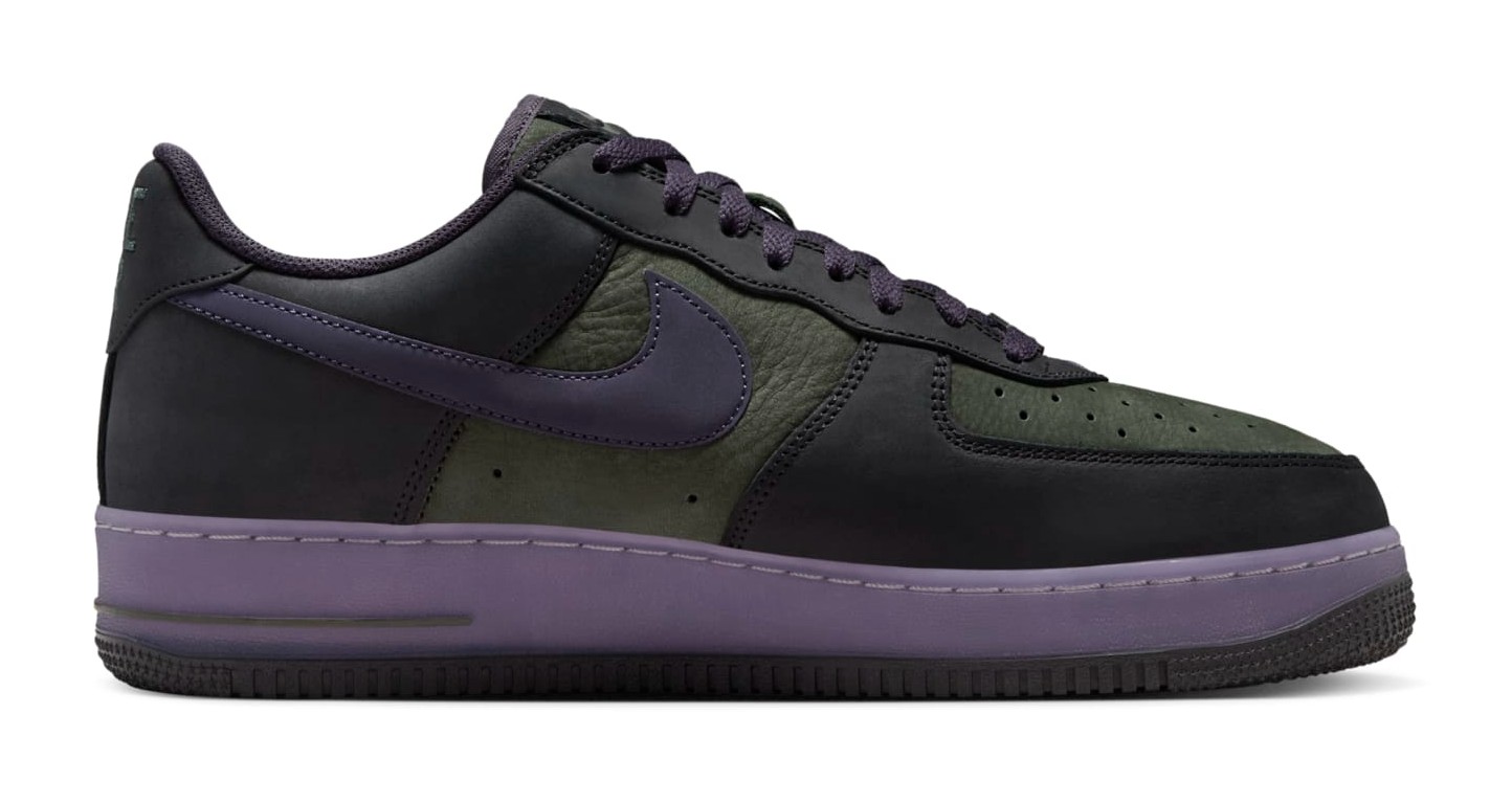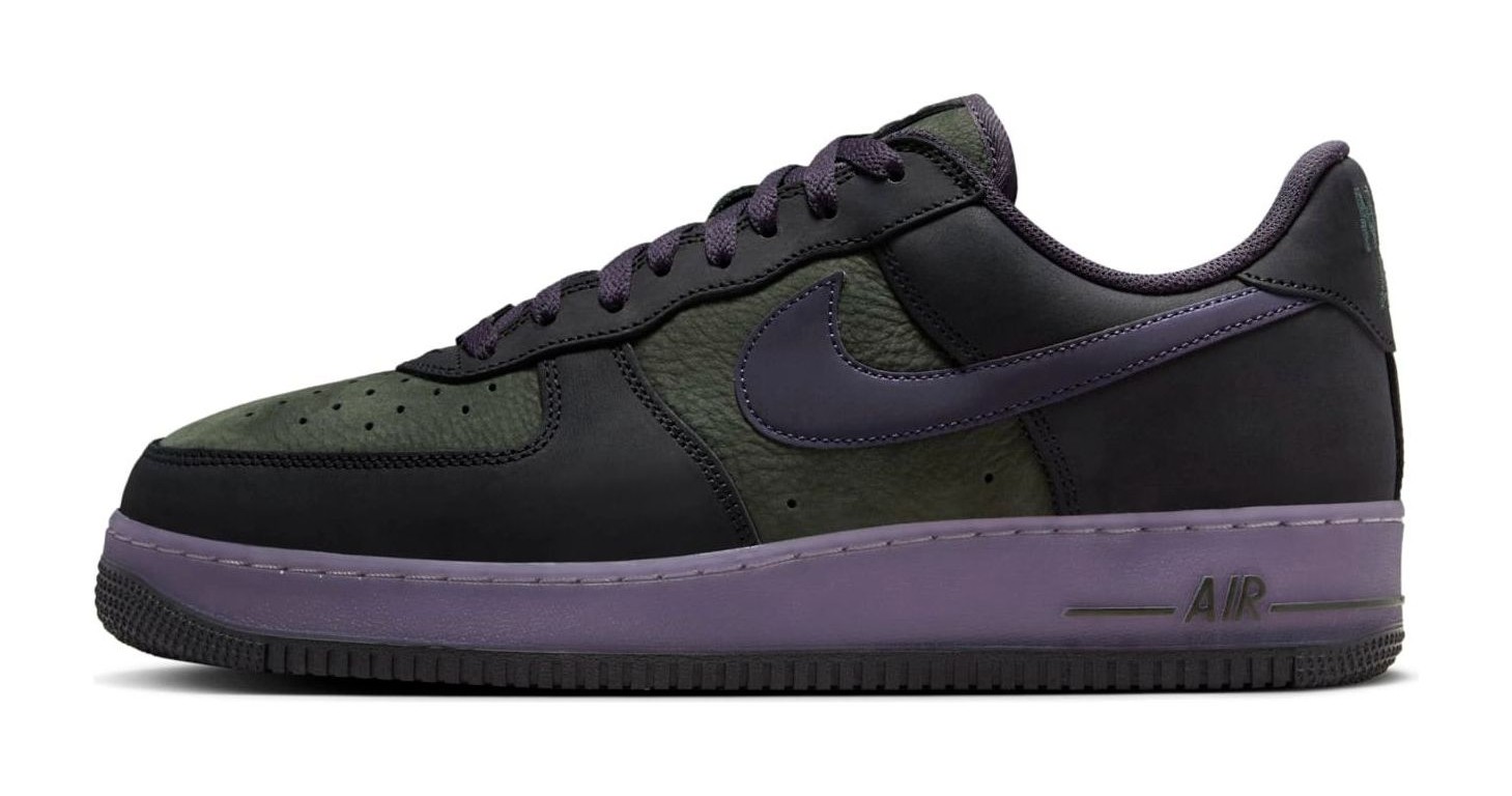 This shoe is part of the "World Tour" collection, paying homage to the vibrant, nighttime aesthetic of Seoul, South Korea. The upper features a base of dark Medium Olive (or a dark green hue) tumbled leather with Black overlays. The design is highlighted by vibrant Amethyst Smoke (a deep purple) on the laces and a semi-translucent midsole. The Swoosh is often described as reflective purple. Thematic details include a star-shaped lace dubrae and an embroidered Taegeuk symbol (South Korean national symbol) on the interior of the heel, alongside an inner tongue embroidery of "1982" referencing a historical event in South Korea.