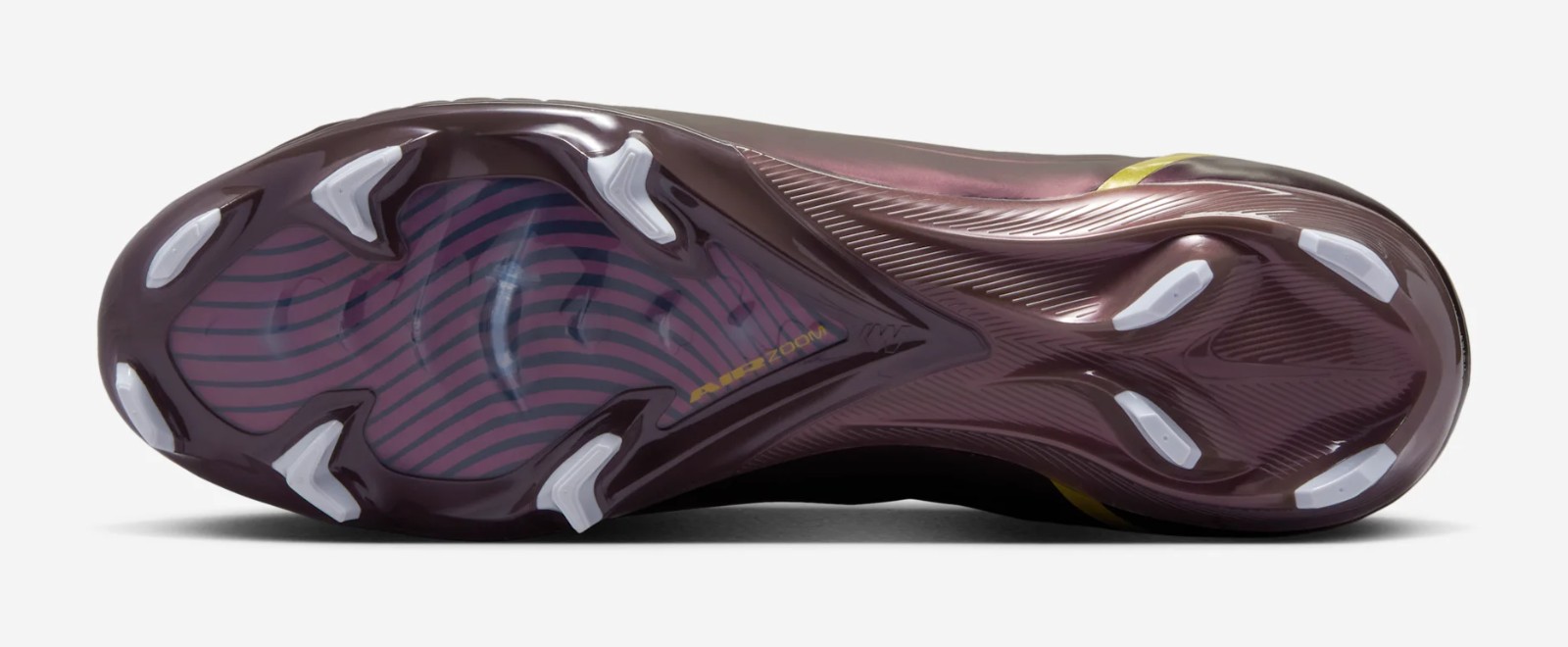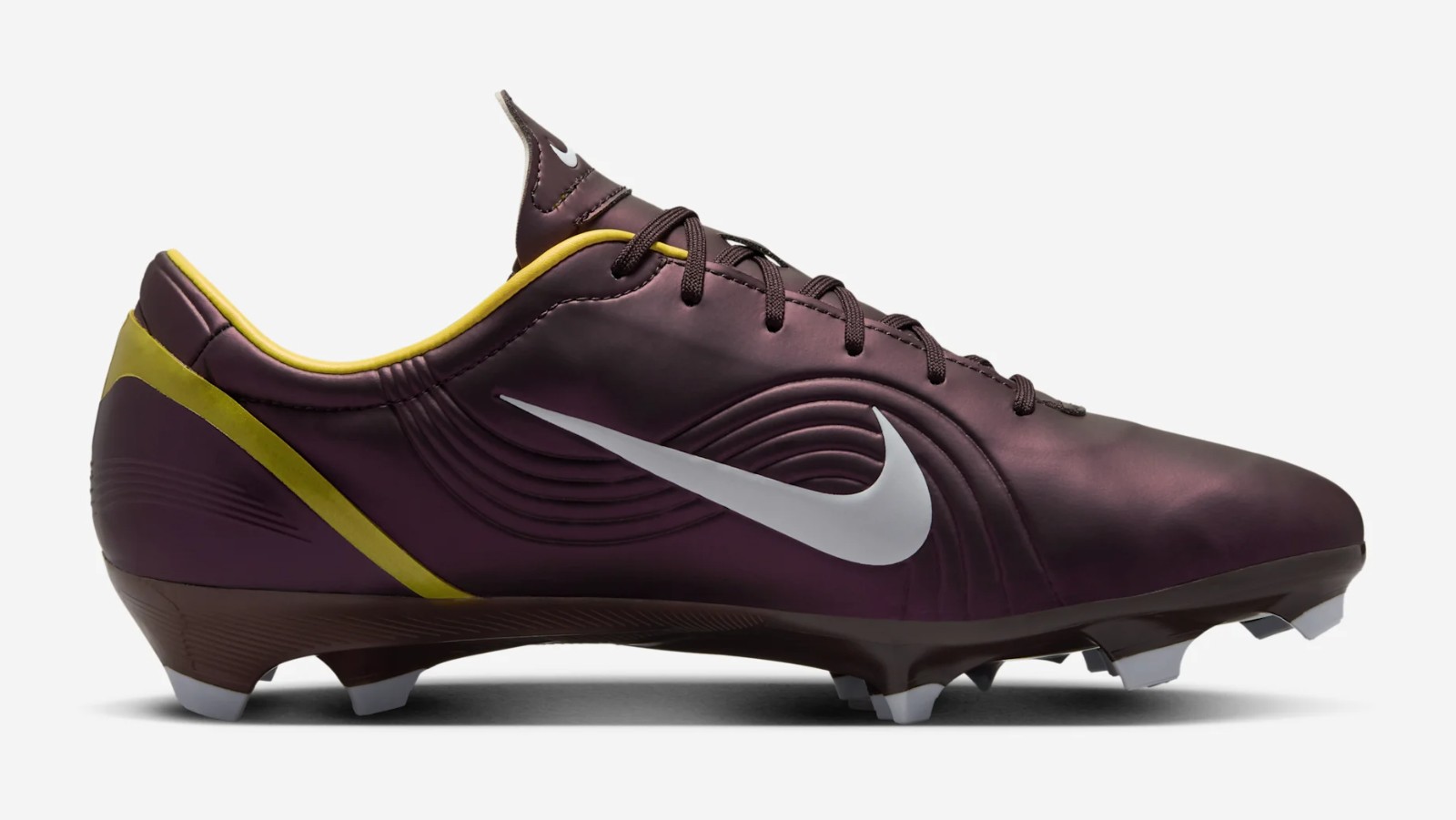 This football boot is a reissue of the 2002 Mercurial Vapor 1, the boot worn by Cristiano Ronaldo during his professional debut. It features a dark, almost purplish-brown synthetic leather upper (Dark Cinder) with bright yellow/gold accents (Maize) on the heel and branding. The Regeneration edition includes modern upgrades like a Zoom Air unit in the soleplate for enhanced responsiveness and current-generation stud patterns for better traction on Firm Ground (FG).