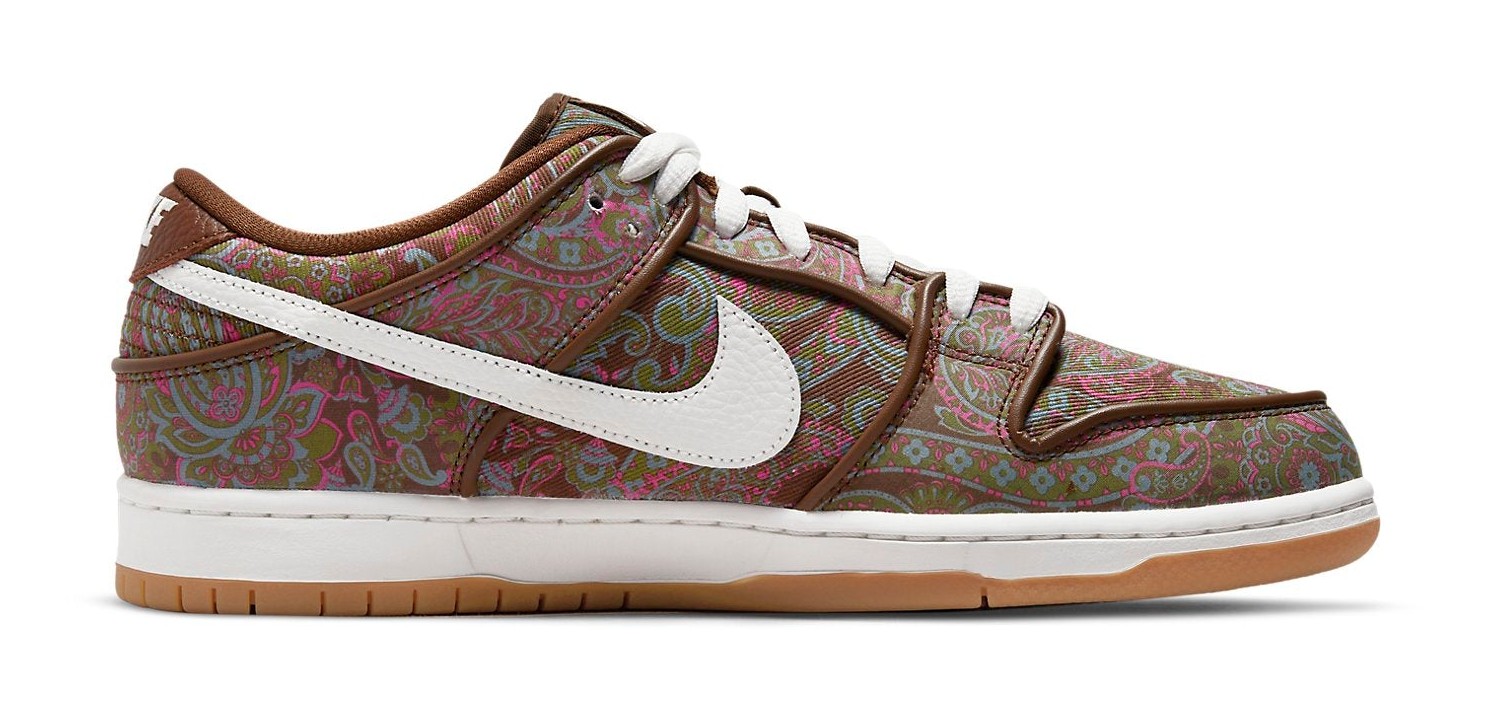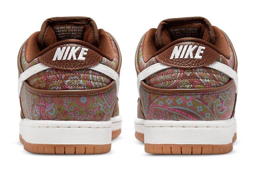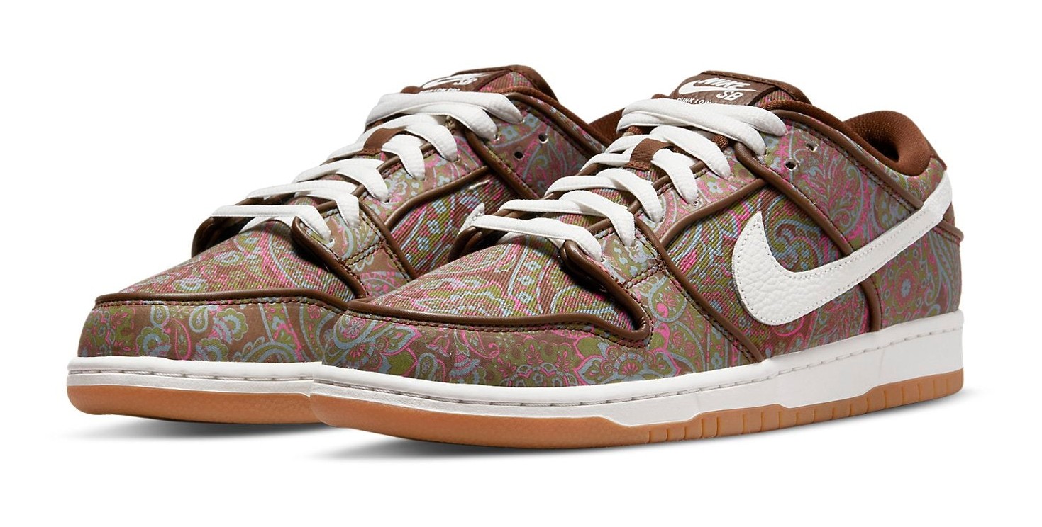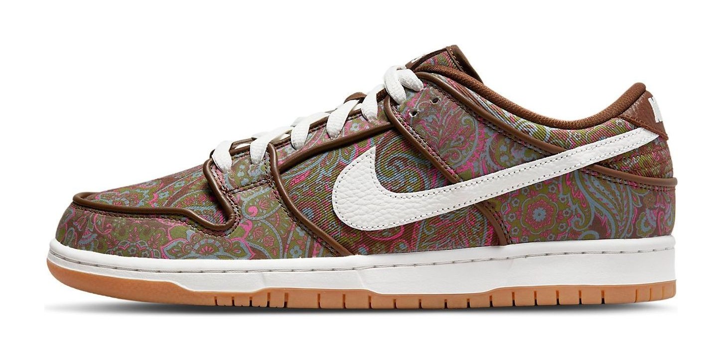 This sneaker features a canvas upper entirely covered in a striking, ornamental, multi-color paisley pattern, with hues of brown, green, and pink/burgundy. The colorful upper is contrasted by clean Summit White leather on the Swooshes, laces, and midsole. The design is finished with a gum rubber outsole, creating a vintage, 70s-inspired aesthetic with skate-ready durability. The canvas upper is sometimes noted for having a potential "tear-away" feature, revealing different colors underneath.
