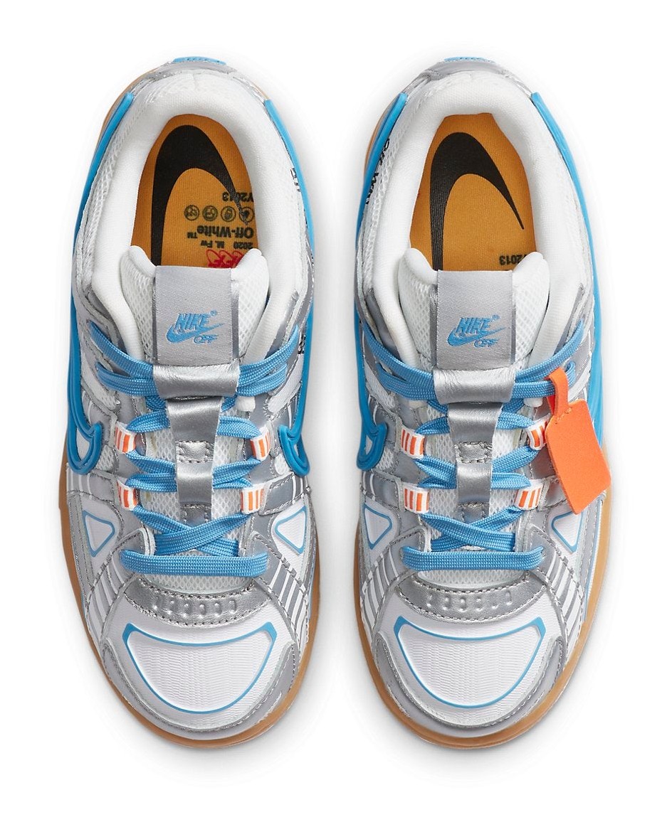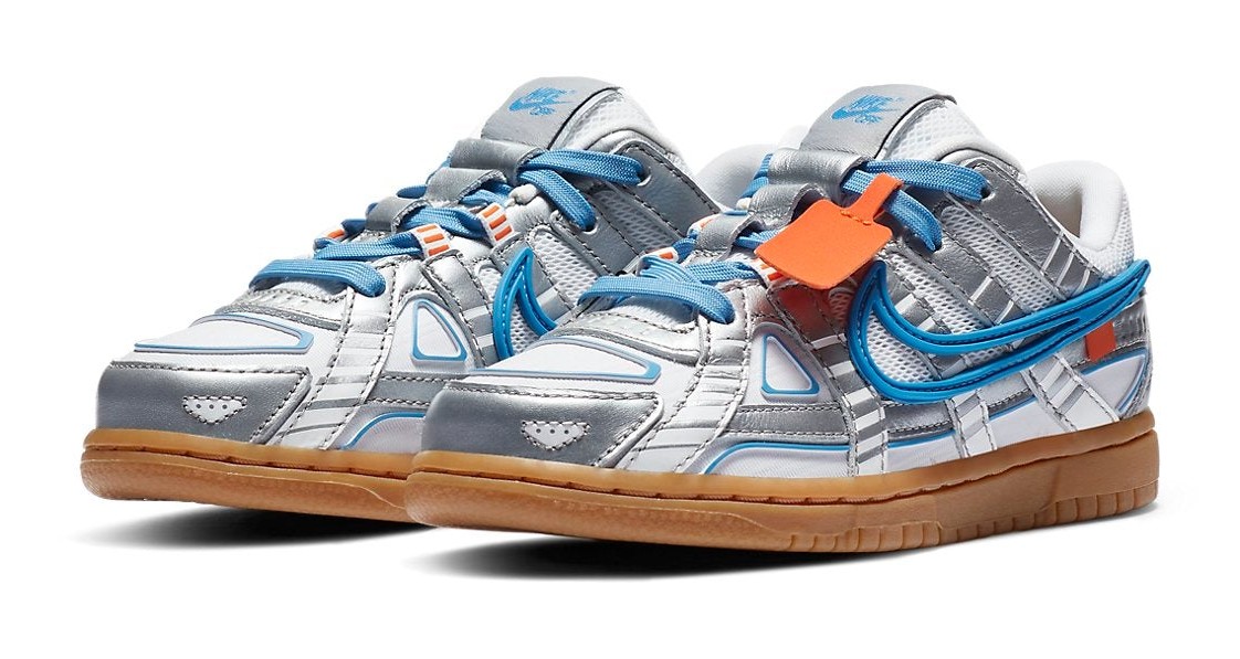 This is the Preschool-sized version of a regional exclusive release, which was part of a trio of colorways for Virgil Abloh's new hybrid silhouette that blends the Nike Dunk with elements from the P-6000 runner. The sneaker features a White mesh base wrapped with metallic silver leather overlays that form a structured "cage" inspired by technical runners. University Blue accents highlight the laces, the Nike Air branding on the heel tab, and the visible Air unit window in the gum-colored outsole. The shoe includes signature Off-White detailing such as the orange tag, a conspicuous zip-tie, and medial side text branding. This colorway was exclusively released in the Europe, Middle East, and Africa (EMEA) regions.