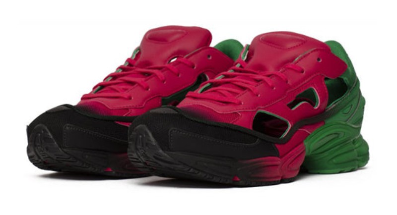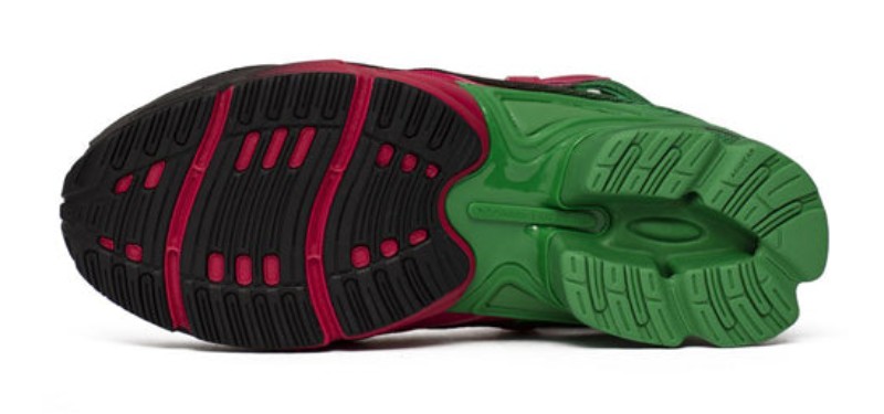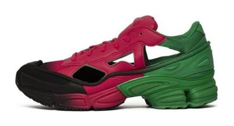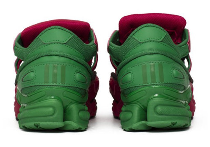 The Adidas Raf Simons x Replicant Ozweego (EE7932) "Green Berry" is a high-fashion, chunky lifestyle sneaker that reinterprets the '90s-inspired Ozweego runner. The textile and synthetic upper is distinguished by its vibrant, contrasting colorway, featuring a bold gradient effect. The toecap and areas of the upper are typically a dark color (Core Black), fading into Green and Vivid Berry (a deep magenta/purple color). The shoe is built on a thick, multi-layered midsole, characteristic of Raf Simons' chunky sneaker aesthetic, and features a durable rubber outsole. The distinctive cut-outs and color combination make this a striking and avant-garde piece from the collaboration.