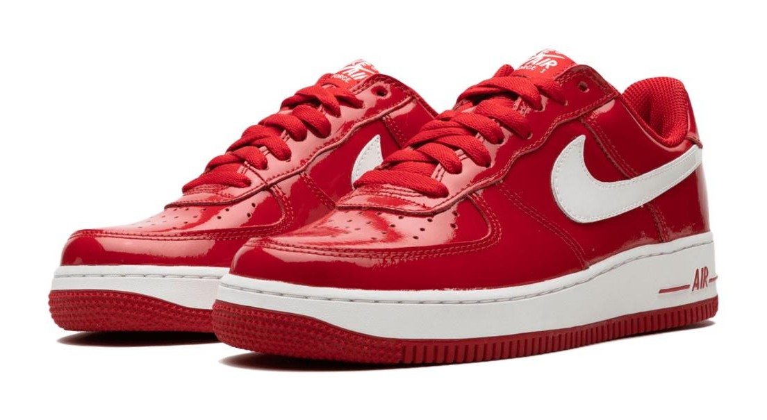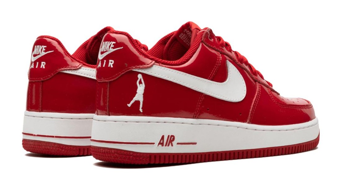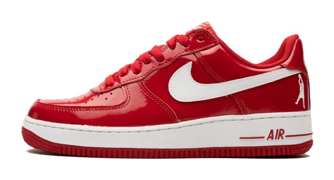 This is one of the original signature models for NBA star Rasheed Wallace, featuring a colorway associated with his time playing for the Portland Trail Blazers. The entire upper is constructed from a vibrant, glossy Varsity Red patent leather, giving the shoe a bold, monochromatic look. It is sharply contrasted by a White leather Swoosh and outsole. The shoe features Wallace's personal logo—a silhouette of him shooting his signature fadeaway—embroidered on the heel.