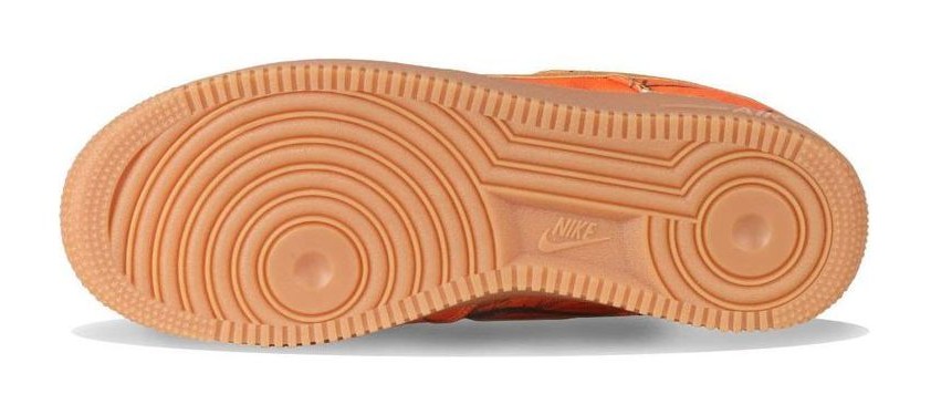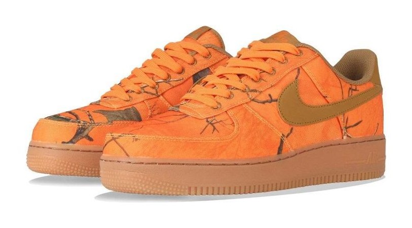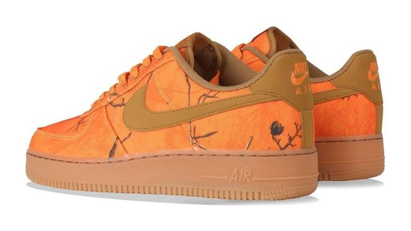 This Air Force 1 Low features an upper covered entirely in a vivid, all-over Realtree camouflage print in a striking Orange Blaze color palette. The print is applied to a durable canvas material, contrasted by matching Orange Blaze leather on the Swoosh and heel tab. It sits atop a clean white midsole and a partially translucent gum rubber outsole, completing the rugged, hunting-inspired look.