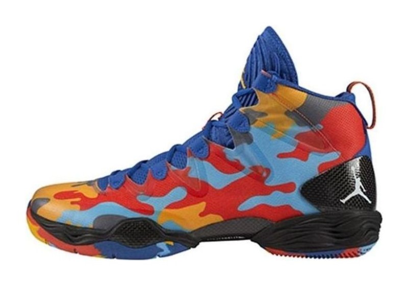 This basketball sneaker is the stripped-down "SE" version of the Air Jordan XX8, which removed the large zippered shroud from the original design to expose the lacing system. The shoe features an all-over camouflage pattern in the signature colors of the Oklahoma City Thunder (OKC): Game Royal, University Blue, and Team Orange. The highly technical upper and Zoom Air cushioning were designed for high-performance on the court.