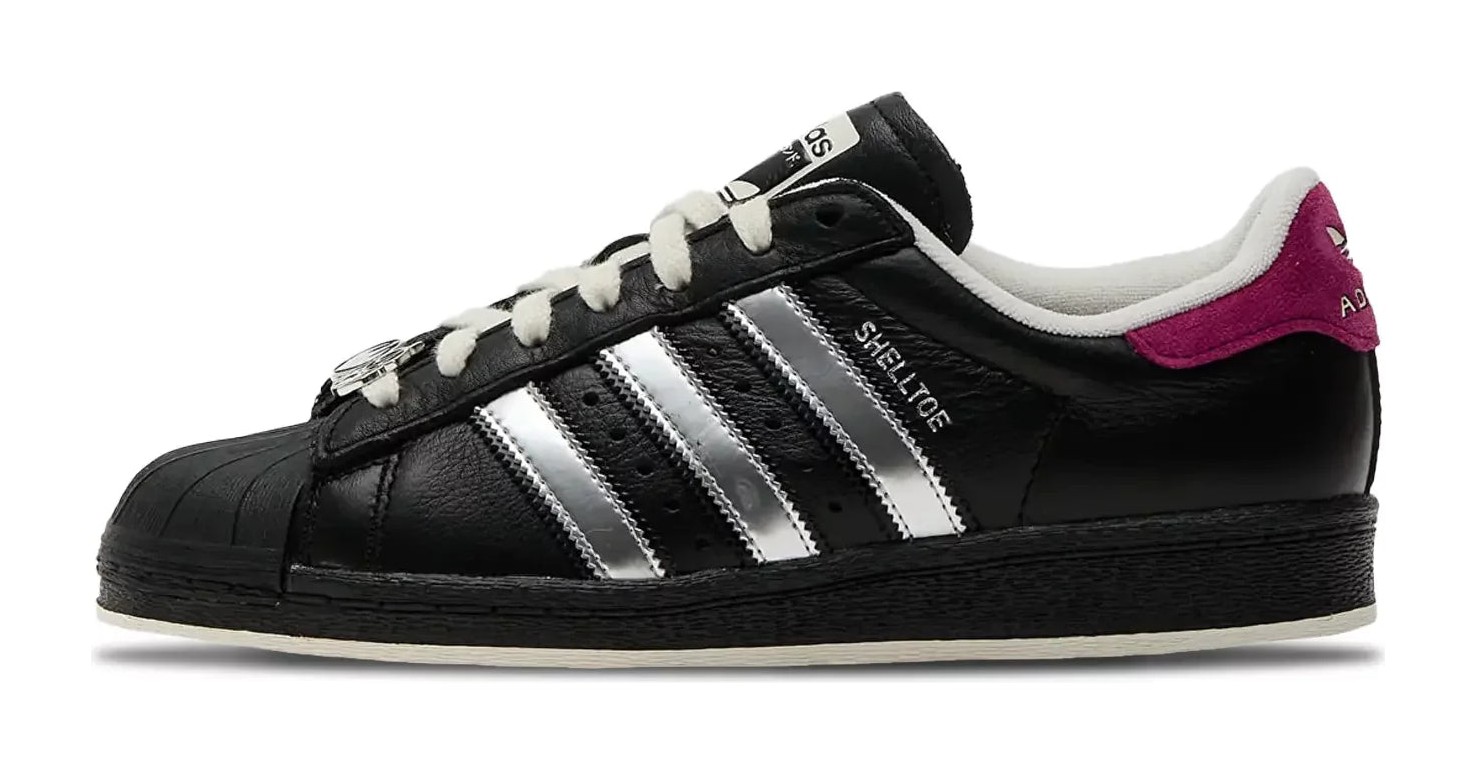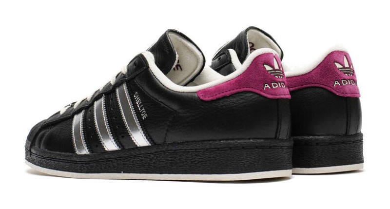 A men's and unisex sneaker that draws inspiration from the TMNT supervillain Shredder. It features a black tumbled leather upper with metallic silver Three-Stripes and a black rubber shell toe. A violet suede heel tab adds a contrasting pop of color, while "SHELLTOE" and "SHREDDER" lettering adorn the lateral and medial sides, respectively. The insole features a graphic of Shredder, and the sneaker comes in special toy-inspired packaging.