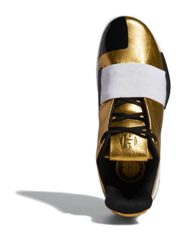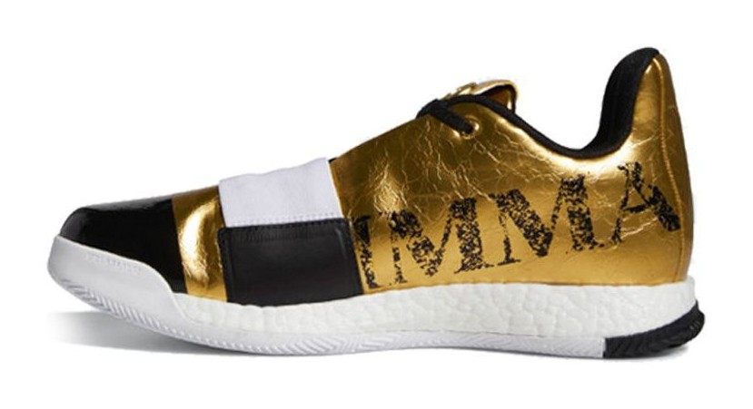 This basketball shoe celebrates the sentimental message "Imma Be A Star" that James Harden once wrote to his mother in high school. The upper is dominated by a luxurious, shimmering Metallic Gold colorway, symbolizing stardom and success. This metallic finish is contrasted with clean Footwear White and deep Core Black accents, seen on the Boost midsole, and three-stripes branding. The shoe is built with a lightweight upper and features responsive full-length Boost cushioning for explosive on-court performance.