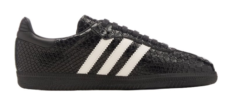 This is a luxury, limited-edition take on the Samba, handcrafted in Italy. The upper is made from hand-polished Italian Cordovan cow leather, which is embossed with a glossy, reptilian or croc-skin texture throughout the black panels. The iconic serrated three stripes are in contrasting "Footwear White" leather, and the insole features a vibrant "Team Victory Red" color.