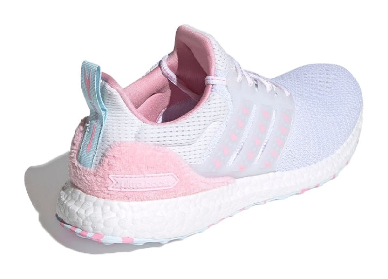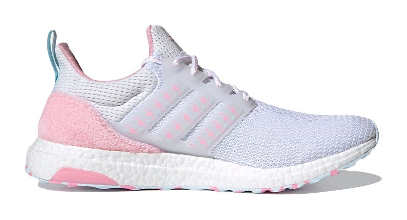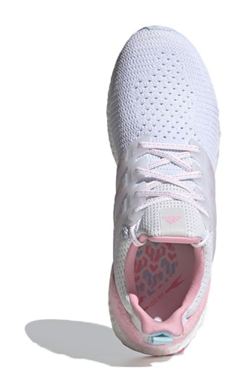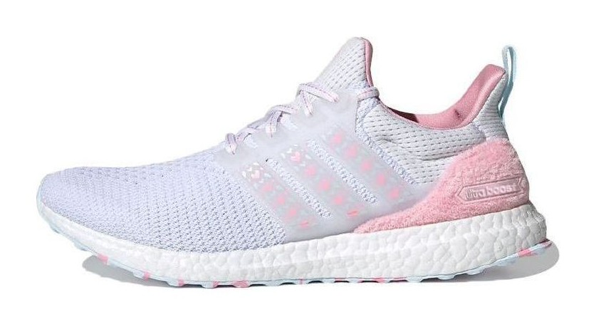 The adidas UltraBOOST DNA 'Valentine's Day' in Cloud White / Sky Tint / Light Pink is a subtly romantic and comfortable sneaker. The upper features a bright Cloud White Primeknit textile, which is lightweight and breathable. The sneaker incorporates holiday-themed accents, primarily through the use of Light Pink and a hint of Sky Tint (Light Blue) on the cage, heel counter, or midsole details. The most notable feature is the inclusion of small, embroidered hearts or Valentine's Day-related graphics subtly integrated into the knit pattern or printed on the tongue or sockliner. The shoe sits atop the responsive BOOST midsole for superior cushioning and energy return, making it a stylish and comfortable choice for casual wear.