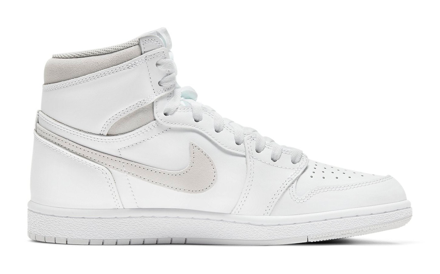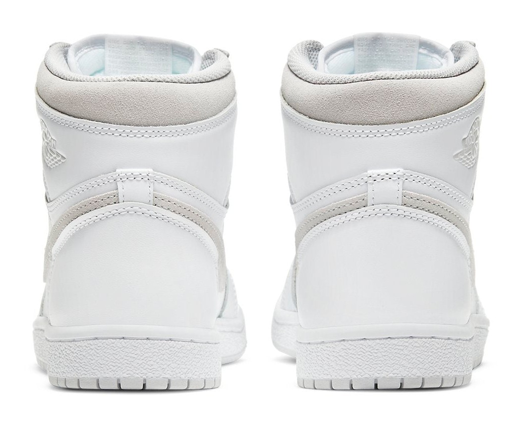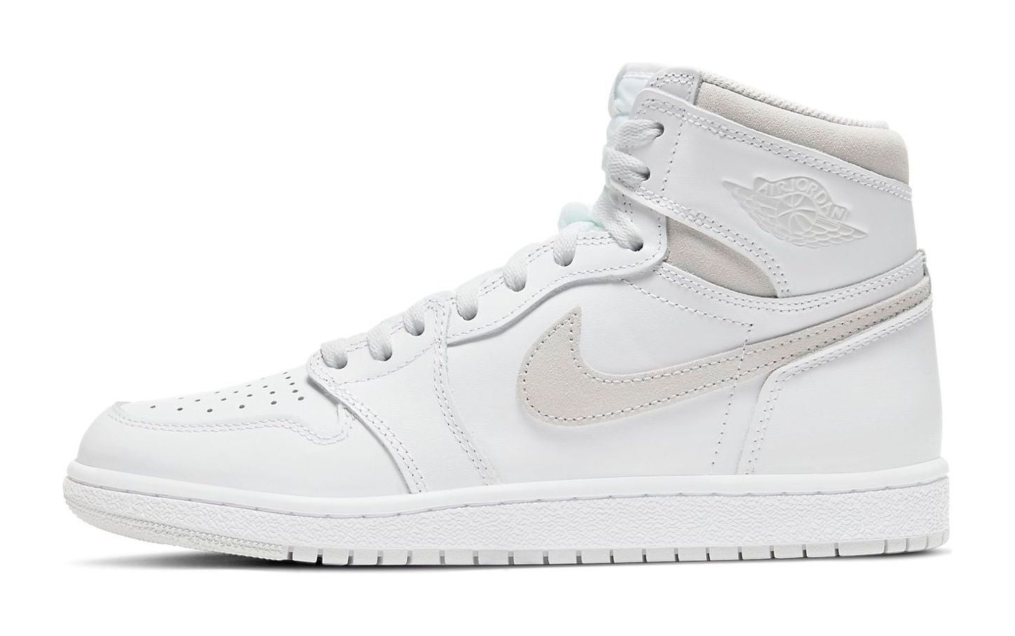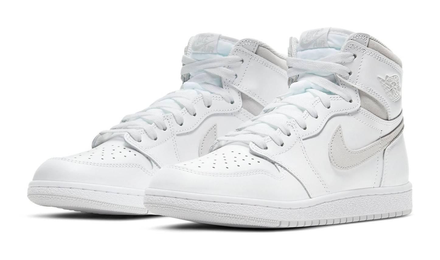This sneaker is a direct reissue of an original 1985 colorway and utilizes the accurate Air Jordan 1 High '85 shape, which features a taller collar and revised panel cut compared to modern retros. The upper is predominantly constructed of white premium smooth leather. The minimalist design is accented with Neutral Grey suede on the Swoosh and on the ankle collar. It features true "OG" specifications, including the "Nike Air" logo woven on the tongue tag and the classic black Wings logo stamped on the lateral collar flap. It was the first time this original colorway had been retroed since the 1985 release.