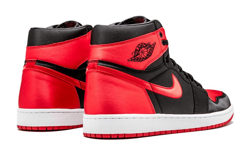 This model re-imagines the original "Bred" (Black and Red) colorway, which was famously "banned" by the NBA in 1985. The key feature of this release is the material change: the standard leather upper is largely replaced with premium Black and University Red satin fabric on the toe box, mid-panel, collar, and heel overlays. The interior lining is also satin for a luxurious feel. The tongue is nylon, and the classic Nike Air branding is on the tongue tag. This version was an extremely limited release, with each pair individually numbered out of 501 on the inner collar, making it a very rare collector's item.