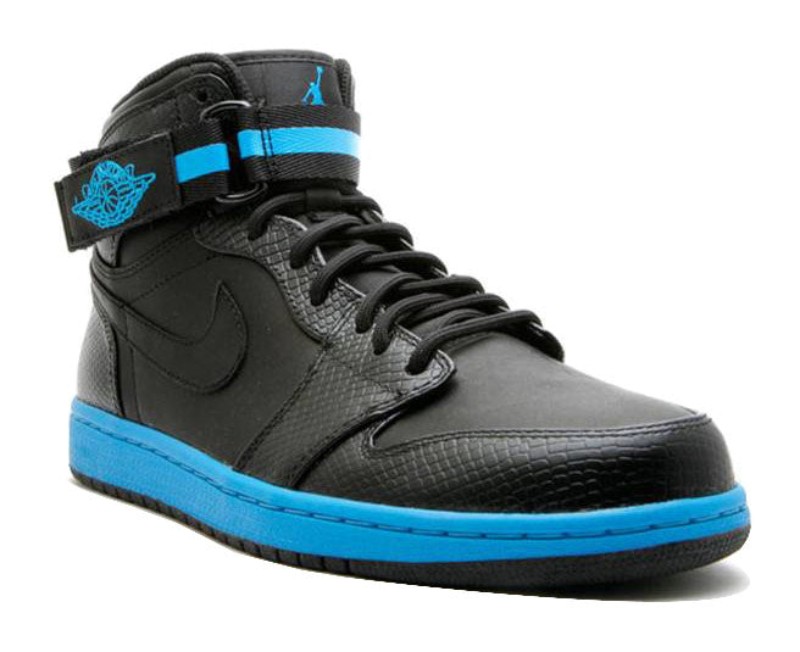 This shoe from the Jordan Brand is a high-top Air Jordan 1 featuring an integrated, removable strap for ankle support. The upper is constructed primarily from black leather, with the entire shoe presenting a dark base. The contrasting color, Orion Blue (a vibrant shade of teal/blue), is used sparingly, most notably on the outsole, which wraps up slightly onto the heel. The inner lining and the branding elements, such as the "Jumpman" logo on the tongue and the "Wings" logo on the collar, also feature the Orion Blue color, providing a pop of contrast against the mostly black upper.