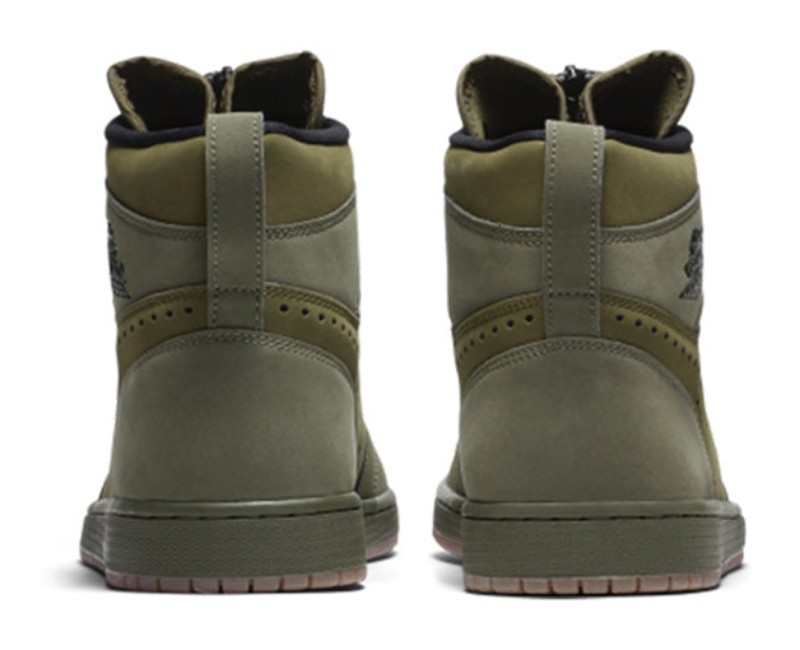 This model is a modern, lifestyle reimagining of the classic Air Jordan 1 High, distinguished by replacing the traditional lacing system with a central zipper that runs from the tongue to the ankle. The upper is dressed predominantly in a durable, muted Olive Canvas green. Contrasting Black accents appear on the zipper tape, the collar lining, and the pull-tab on the heel. The shoe is finished with a traditional Gum rubber outsole, which complements the earth-toned upper. The iconic Nike Swoosh is represented by a subtle, perforated pattern on the side panels. The tongue features a classic Nike Air logo patch in red and black, which is visible when the zipper is partially opened.