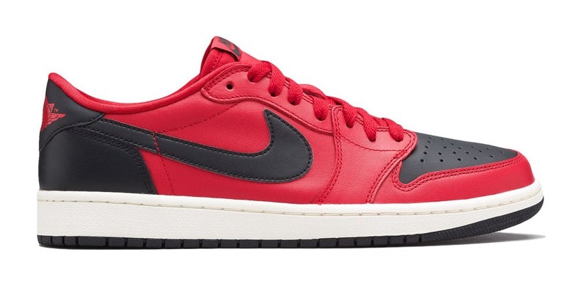 A color-flip of the iconic "Bred" (Black and Red) colorway, this shoe is often nicknamed the "Reverse Bred." It features an all-leather upper where the toebox, heel, and Swoosh are covered in a vibrant Gym Red, while the quarter panels, tongue, and toecap are in classic Black. The color blocking is the inverse of the original "Bred" Air Jordan 1 Low OG. It maintains the original details with Nike Air branding on the tongue and the Wings logo stitched onto the heel. The shoe is finished with a white "Sail" midsole for a vintage look and a black rubber outsole.