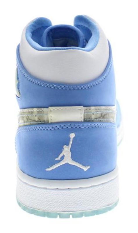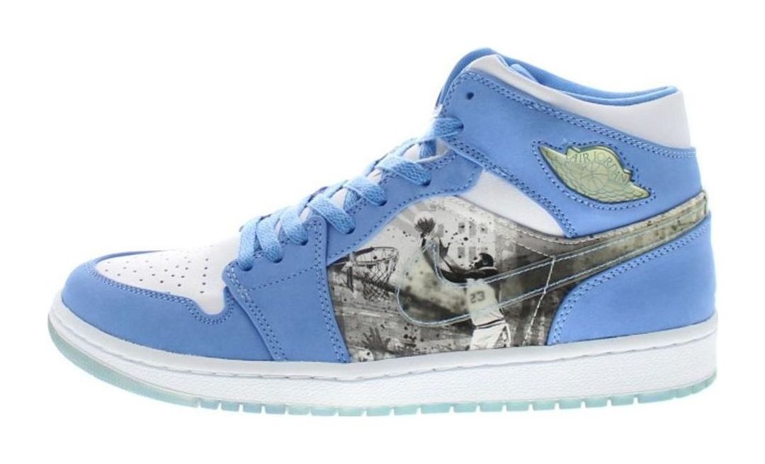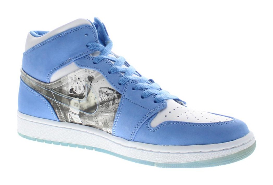 This model from 2007 is an elevated version of the Air Jordan 1, featuring premium materials and a colorway dedicated to the University of North Carolina (UNC), where Michael Jordan played college basketball. The shoe has a White leather base with University Blue nubuck overlays on the toe, eyestays, and heel. Black accents the Swoosh, collar, and laces, creating a classic UNC color block. The most unique feature is a subtle, detailed graphic print of Michael Jordan playing in his UNC jersey embossed or printed on the white midfoot panel, honoring his early career.