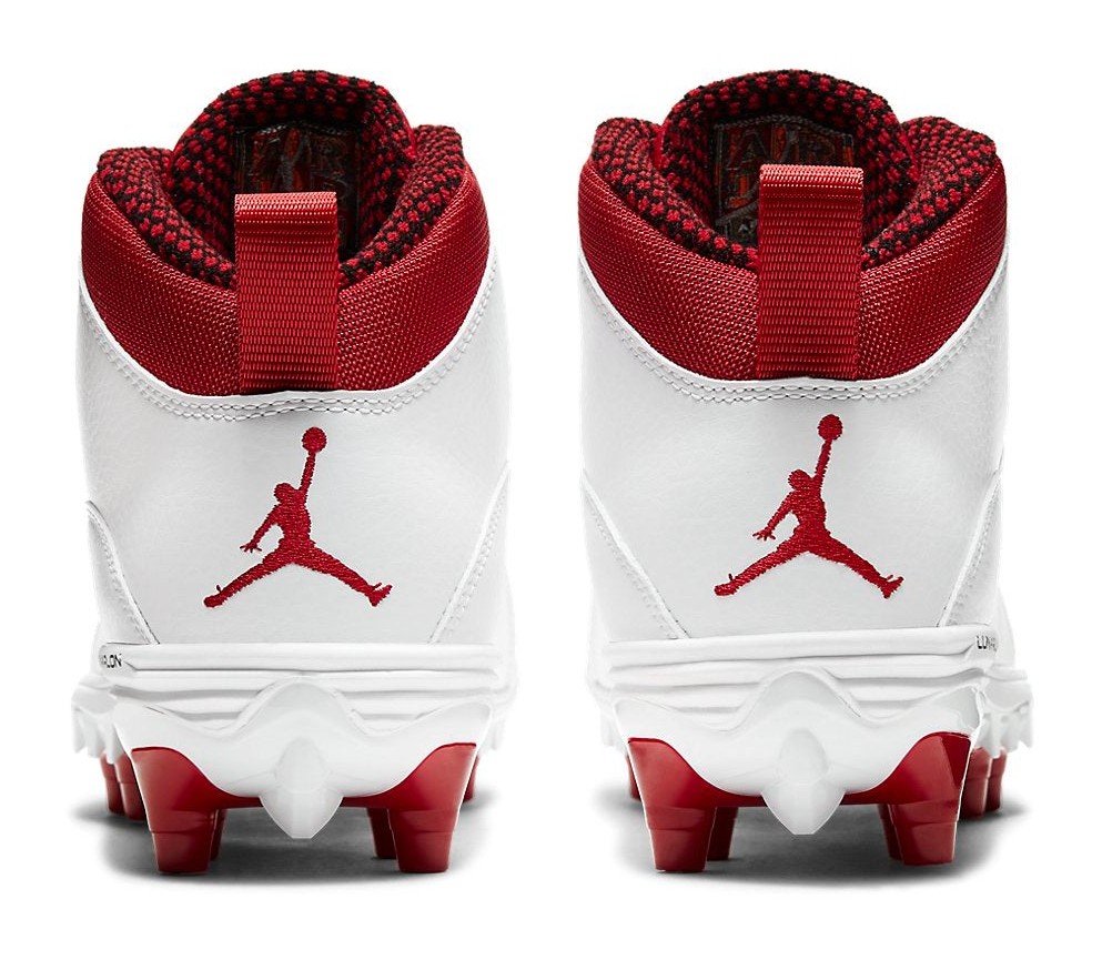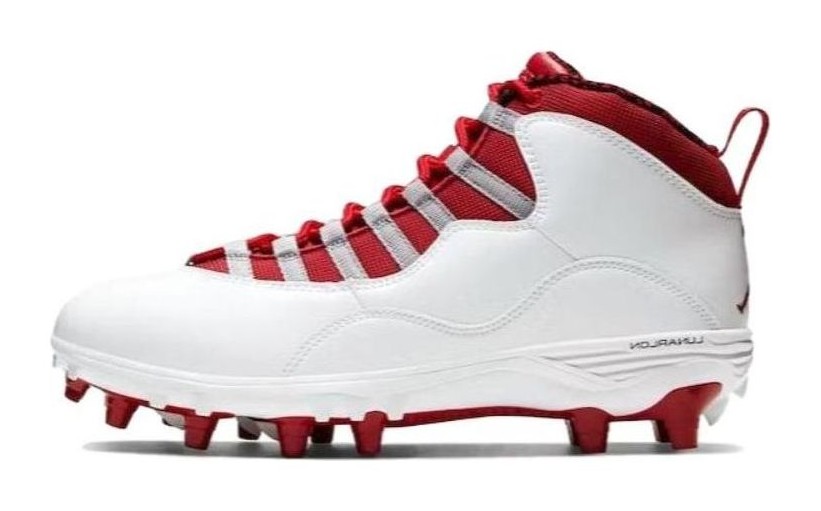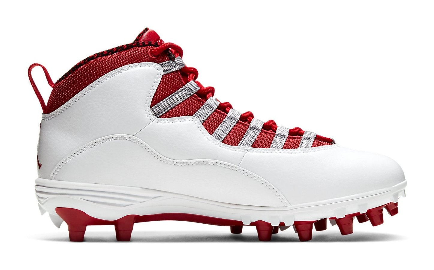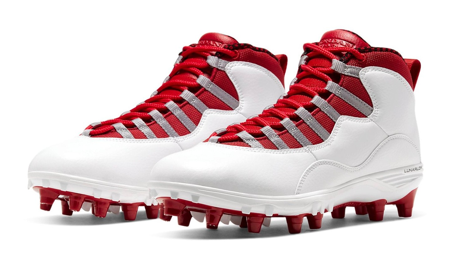 This model is a Turf Detachable (TD) shoe, designed to be used as a cleat for field sports on turf. It features the silhouette of the Air Jordan 10 Mid but with a durable cleated outsole unit. The colorway is a classic white and grey scheme, utilizing a white upper with Light Steel Grey on the laces and outsole. Bright Gym Red accents are featured on the interior lining, Jumpman branding, and the outsole's traction pattern. The shoe's construction provides the style of the Retro 10 while offering the performance needed for the field.