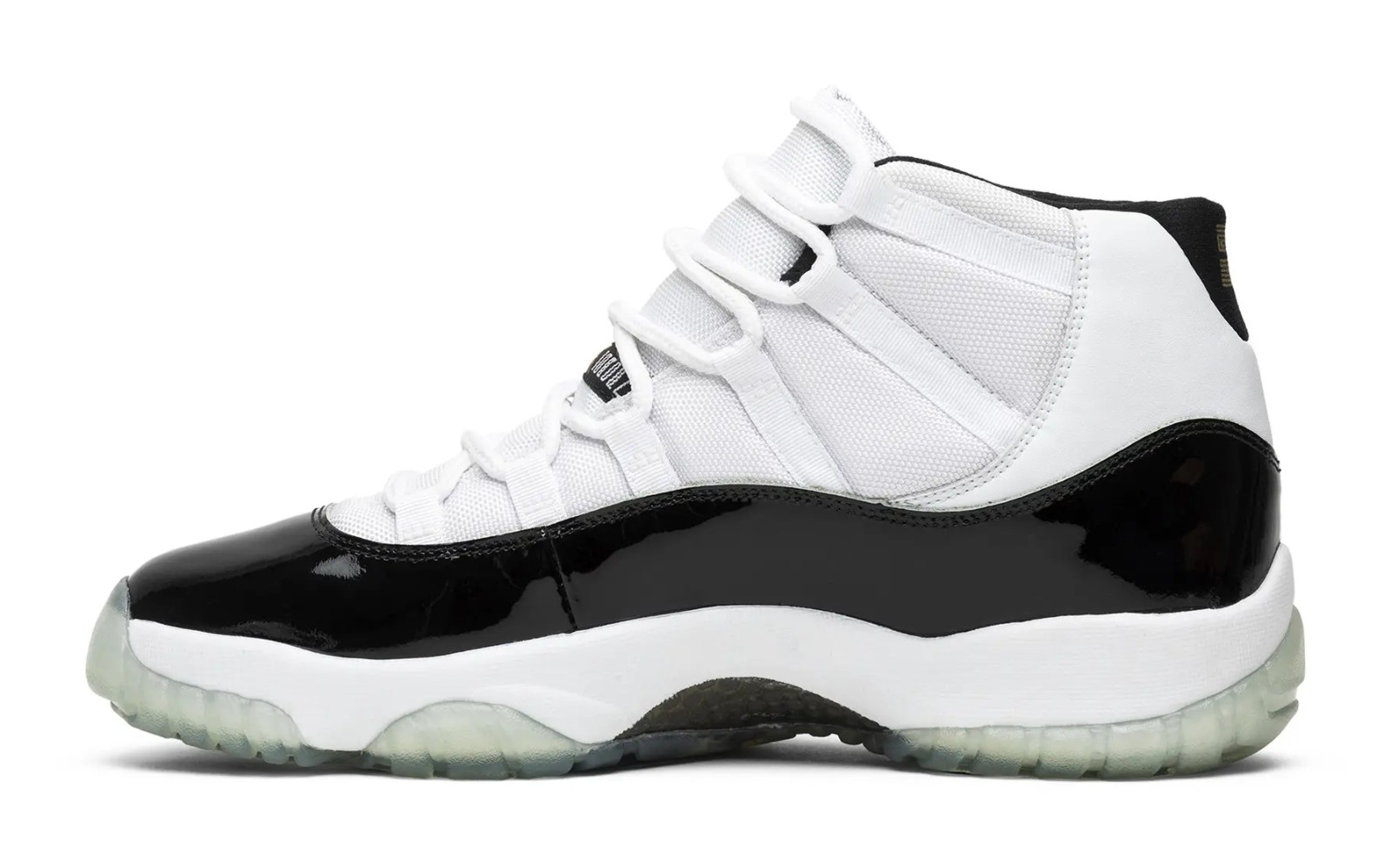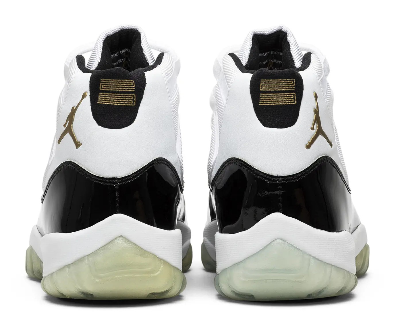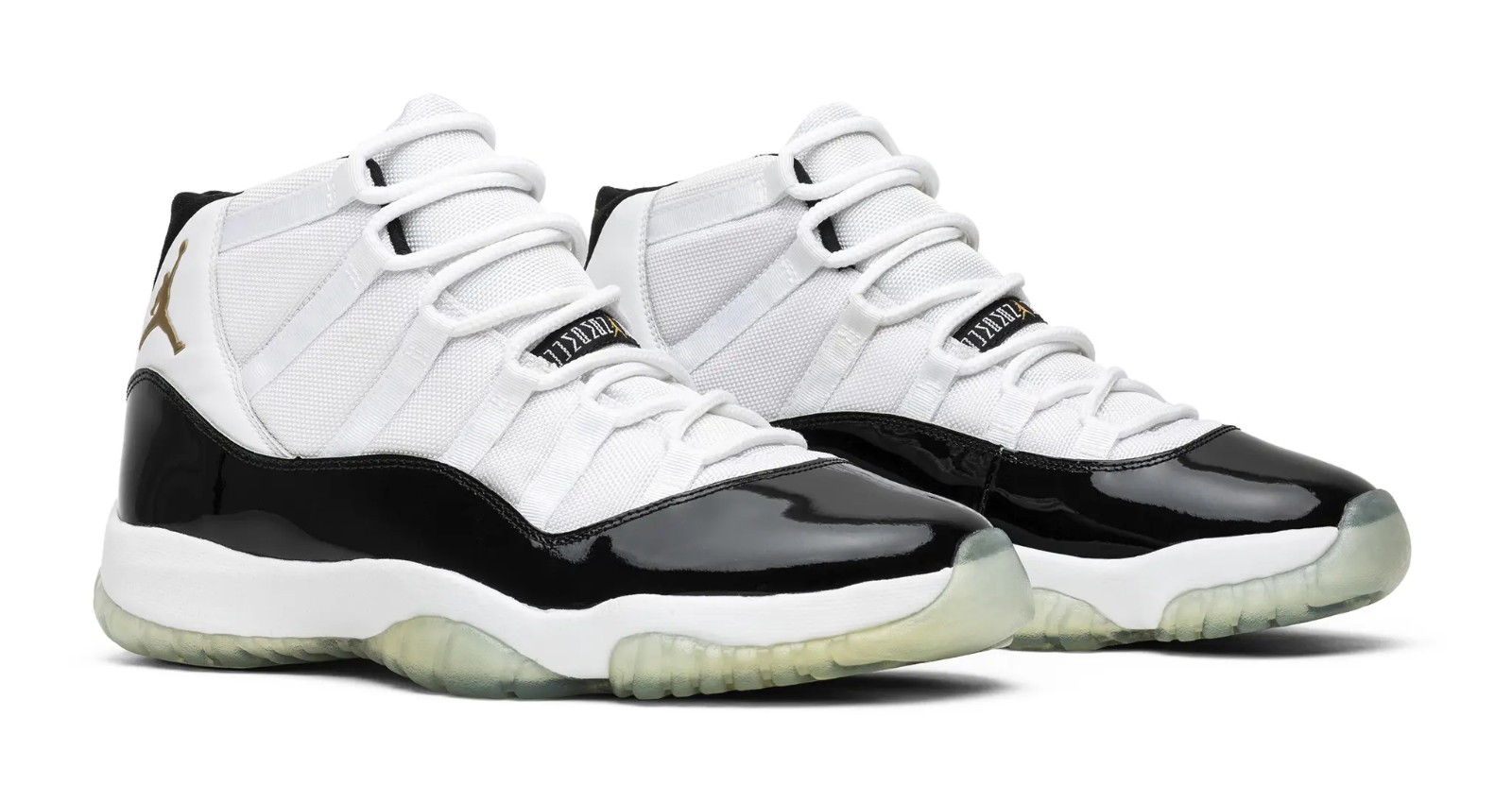 This shoe is a special take on the classic 'Concord' colorway, which was the shoe Michael Jordan wore when he returned to the NBA in 1995. It features the traditional white ballistic nylon upper and black patent leather mudguard, but distinguishes itself with Metallic Gold accents on the Jumpman logo (on the heel) and on the eyelets, symbolizing the two NBA championships the pack was celebrating. The gold color replaces the "Dark Concord" color of the original.
