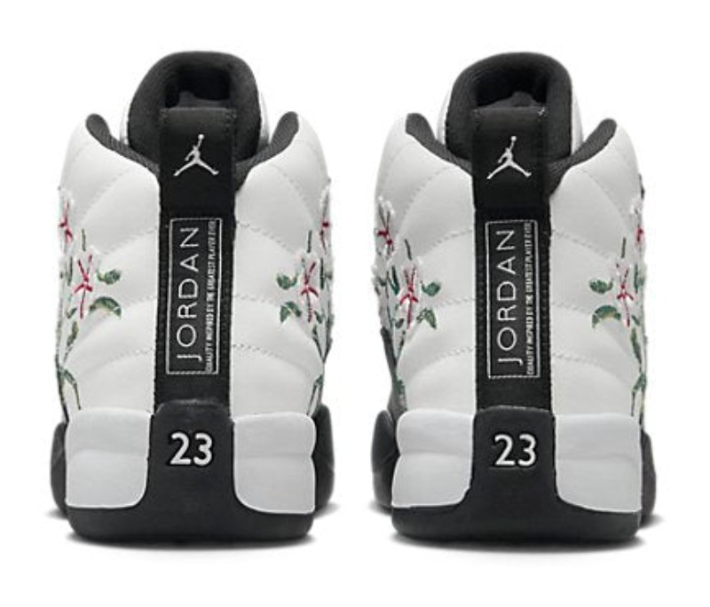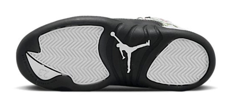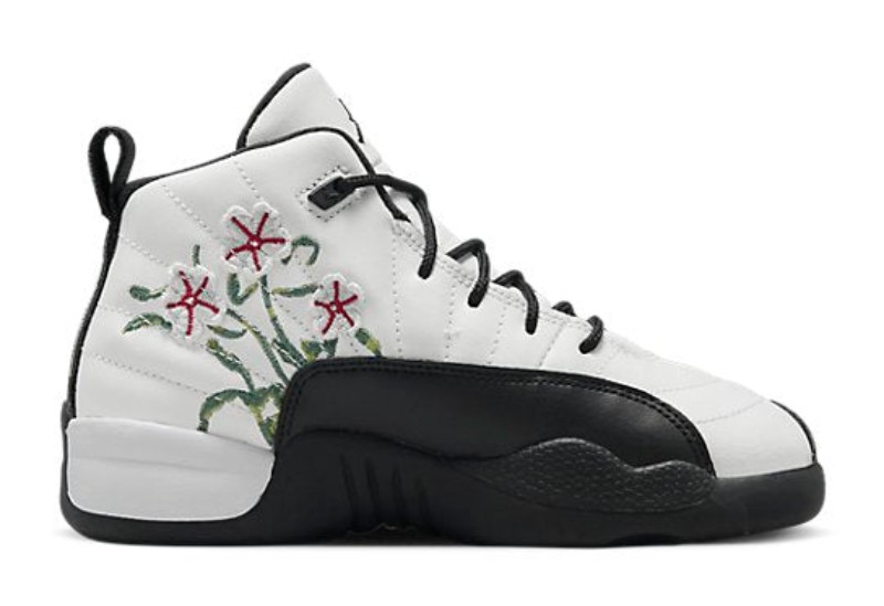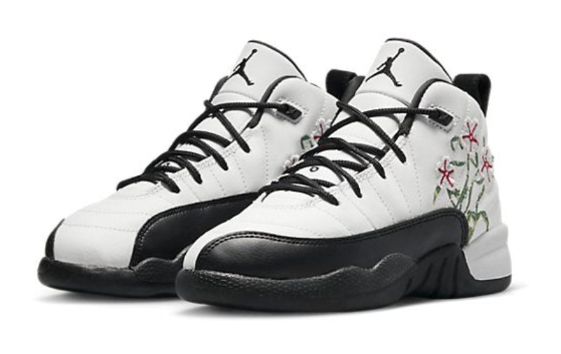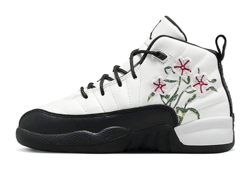 This is the Pre-School (PS) sizing of the "Floral" Air Jordan 12, an exclusive colorway for younger sneaker enthusiasts. It features a clean white tumbled leather upper with the signature mudguard done in black, which contrasts with the vibrant colors on the accents. The shoe earns its nickname from the colorful floral/botanical pattern that is subtly embroidered onto the black textile mudguard.