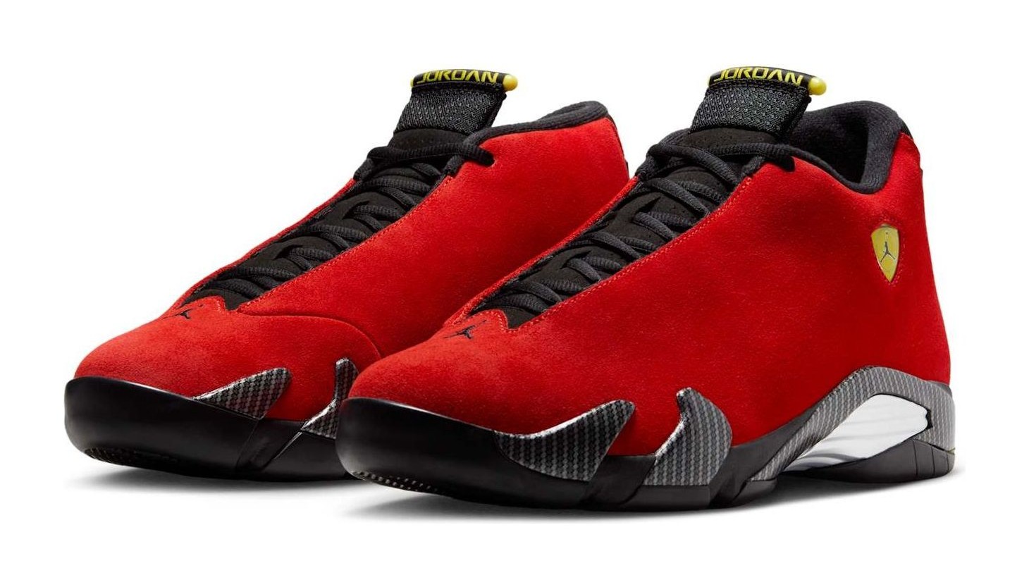 This sneaker is a re-release of the non-original "Ferrari" colorway, famous for its luxurious, single-piece upper inspired by Michael Jordan's Ferrari 550 Maranello. The shoe features a Challenge Red suede upper, reminiscent of the signature Italian racing color Rosso Corsa. Contrasting Black details are found on the midsole, collar, and heel. Vibrant Yellow accents highlight the Jumpman logos on the tongue and toe, and a metallic chrome shank plate is exposed on the midsole, mimicking a car's chassis. Unlike most Air Jordan 14s, the side panels are smooth suede instead of featuring the typical stitched dimples, giving it a sleeker, more automotive-inspired finish.